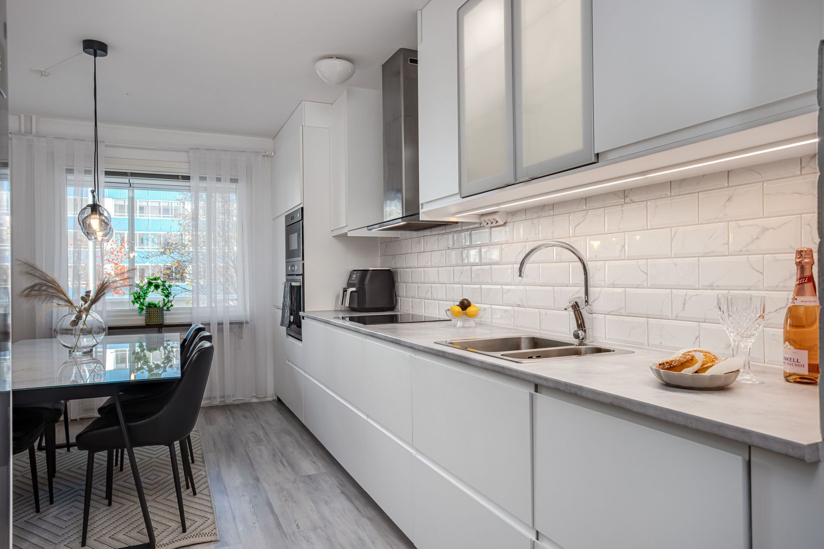 Bostaden präglas av ljus, rymd och moderna materialval. Här möts du av ett socialt kök i stilrent utförande, ett rymligt vardagsrum med plats för både soffgrupp och matsalsdel samt två bra sovrum med gott om förvaring. Lägenheten erbjuder dessutom ett stort, helkaklat badrum med tvättmöjligheter.