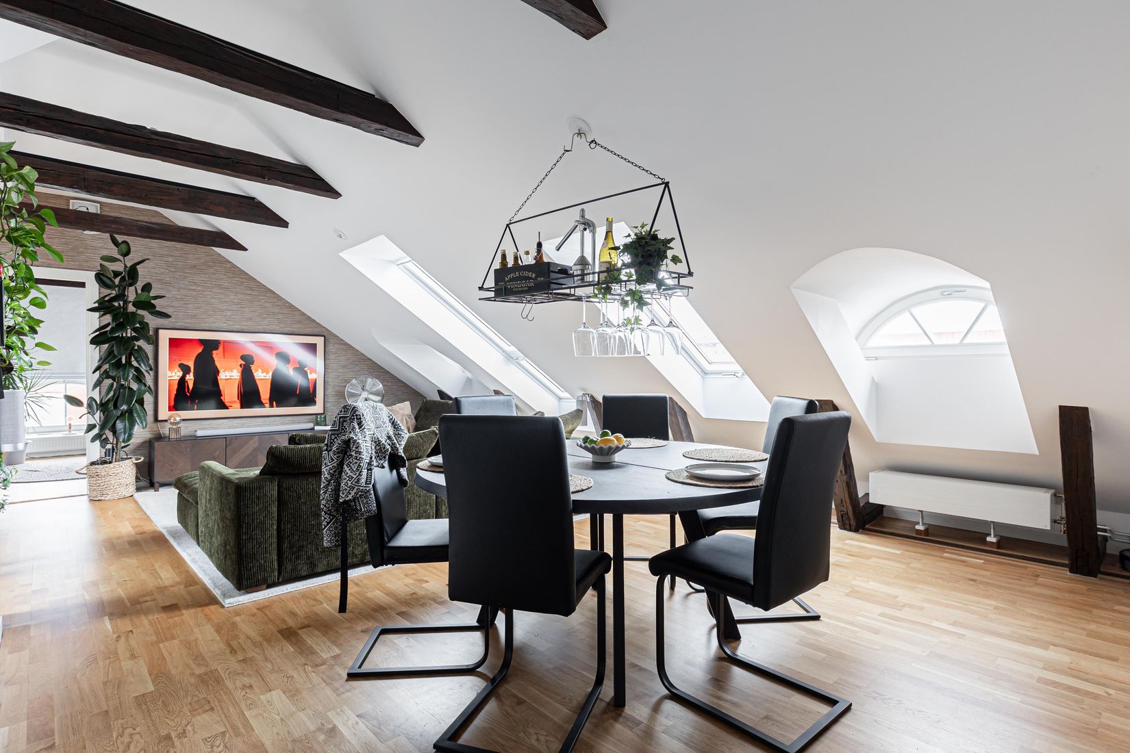 Kök och vardagsrum ligger i öppen planlösning och bildar bostadens naturliga samlingspunkt. Stilrent modernt kök samt ett vardagsrum med gott om plats för både soffgrupp och matplats och ramas in av vindsvåningens unika arkitektur.