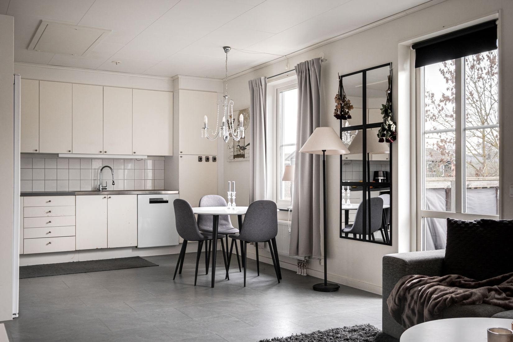 Bostaden har en genomtänkt disposition där kök och vardagsrum samspelar på ett naturligt sätt och skapar fina sociala ytor. Vardagsrummet är rymligt och lättmöblerat med plats för både soffgrupp och matplats. Härifrån nås den stora balkongen som erbjuder gott om utrymme för utemöbler, växter och avkoppling, och som kan nyttjas stora delar av året.