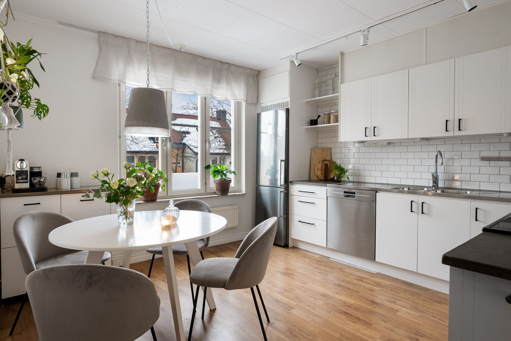 Rakt fram öppnar det ljusa och trevliga vardagsrummet upp sig i delvis öppen miljö med det fina köket. Här finns gott om plats får både matlagning och förvaring och därutöver finns möjlighet till en trevlig matplats för familjen framför fönster ut mot Strandtorget.