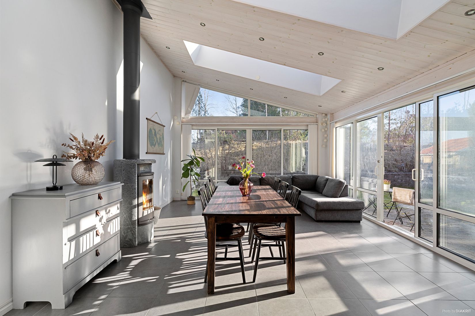 Detta är verkligen husets hjärta – en ljus och luftig yta med takfönster, stora skjutdörrar i glas och en härlig kontakt med trädgården. Eluppvärmt klinkergolv som ger skön värme under kalla dagar. Här flödar ljuset in och skapar en varm och inbjudande atmosfär. Med braskamin, plats för både en generös matgrupp och en bekväm loungedel blir detta en självklar plats för både vardag och fest. Det är här man känner: här vill jag bo.