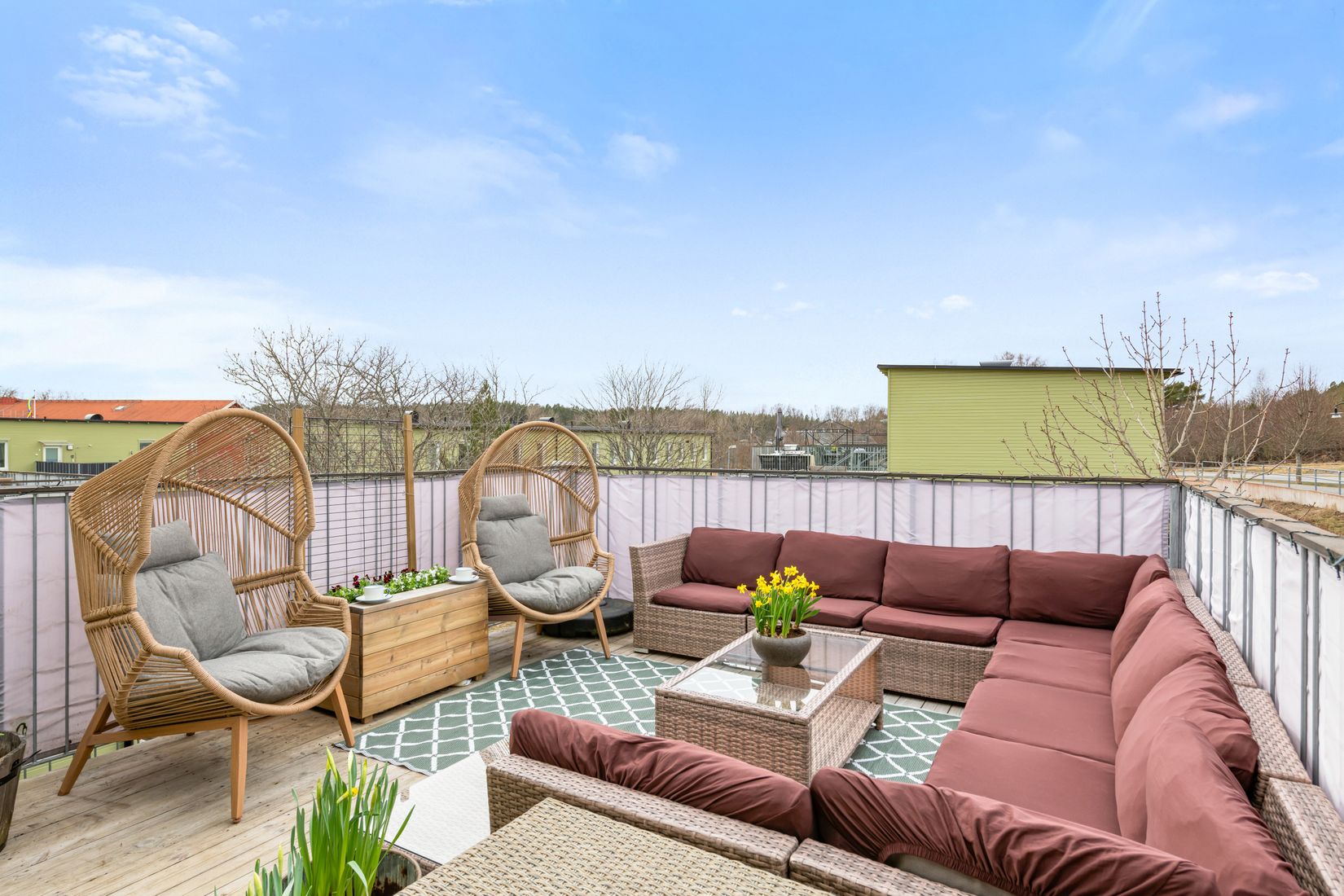 En trappa upp välkomnas du av den generösa terrassen och bostadens egna entré – ett av områdets absolut bästa lägen. Under sommarhalvåret blir terrassen en självklar förlängning av lägenheten, där du kan njuta av solen hela dagen och till sen kväll. Den fria utsikten och det ostörda läget skapar en svårslagen känsla av rymd och trivsel.