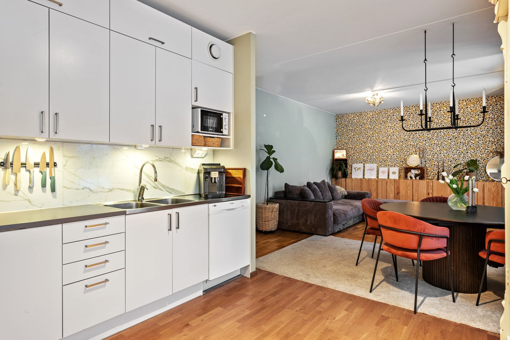 Lägenheten är optimalt planerad och erbjuder generös takhöjd samt en välkomnande hall med goda förvaringsmöjligheter. Den öppna planlösningen mellan kök och vardagsrum, i kombination med stora fönsterpartier, ger ett ljust och luftigt hem med gott om plats för både en större soffgrupp och matbord – perfekt för såväl vardag som sociala tillställningar.