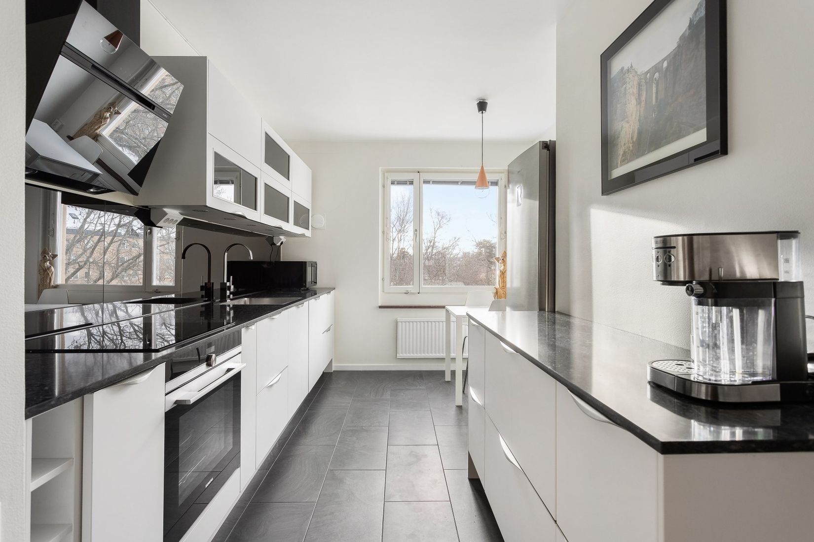 Köket är ljust och socialt, med gott om förvaring och arbetsyta samt plats för ett större matbord. Vidare erbjuds ett stort och luftigt vardagsrum med fantastiskt ljusinsläpp och flexibla möbleringsmöjligheter. Här finns plats för större soffgrupp, matplats eller möjlighet till extra sovplats. Från vardagsrummet nås den soliga balkongen, där du kan njuta av sol stora delar av dagen med utsikt mot grönskande träd.