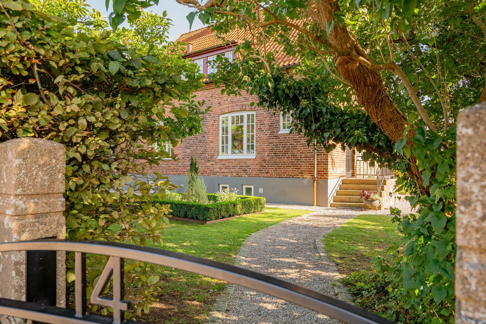 Den grönskande trädgården ramar vackert in huset och leder fram till fasaden i mörkrött handslaget tegel, smårutade vitmålade fönster och trappad gesims - ett uttryck som genast signalerar kvalitet och karaktär.