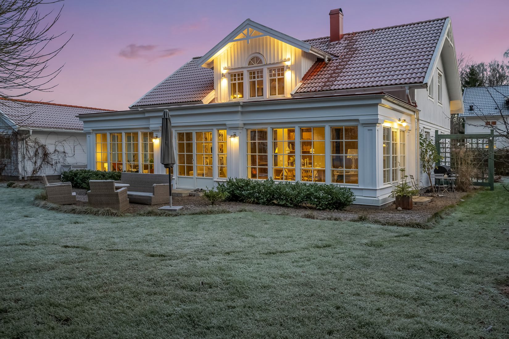 Här finns plats för både vardagsmys och större middagar. Under årets kallare månader sprider braskaminen både värme och extra hemtrevnad. Den vackra längan i glasverandan med spröjsade fönster suddar nästan ut gränsen mellan inne och ute!