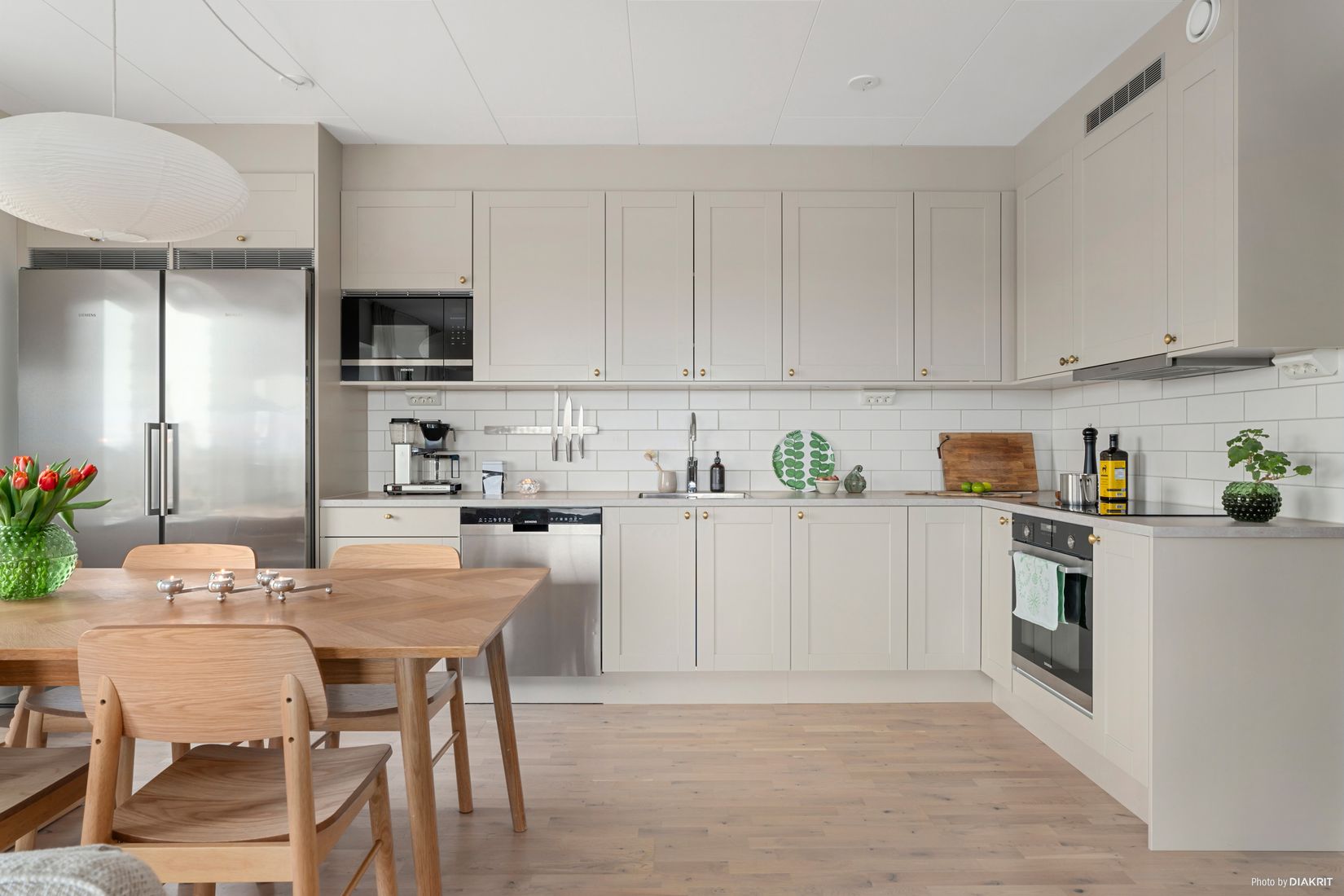 Lägenheten har en öppen planlösning mellan det rymliga vardagsrummet och det stiliga köket, som är inrett i beiga snickerier från Marbodal. Med fönster som vetter åt två olika håll flödar ljuset in, och en dörr leder ut till den stora inglasade balkongen. Här kan du njuta av många härliga stunder oavsett väder. Eftersom elgrill är tillåten på balkongen, kan du se fram emot mysiga grillkvällar med något svalkande i glaset, medan du njuter av solnedgången.