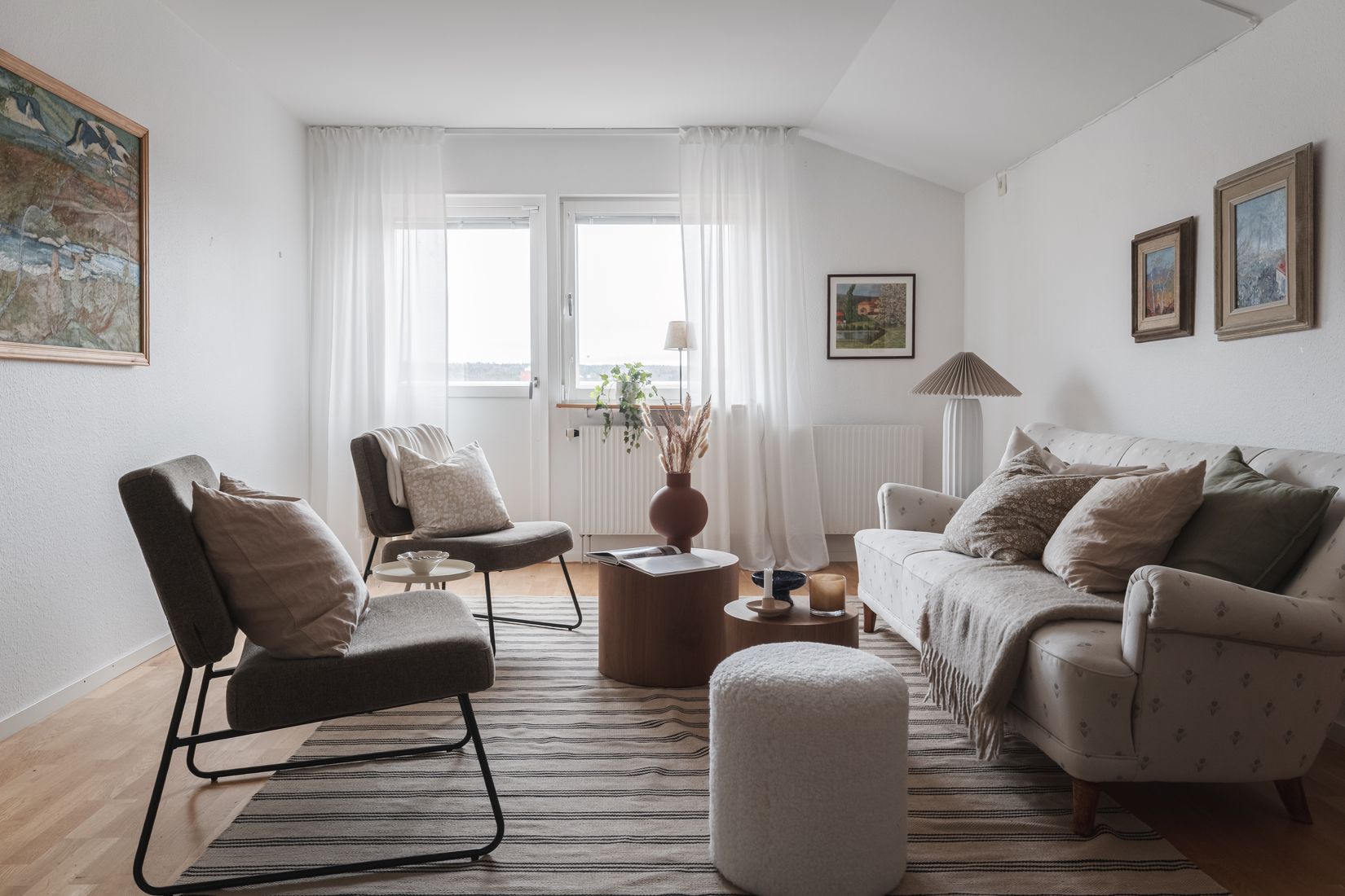 I vardagsrummet är det lätt att möblera och trivas. Här får soffan lätt plats. Från vardagsrummet når ni balkongen med fantastisk utsikt över Södra Sävedalen.