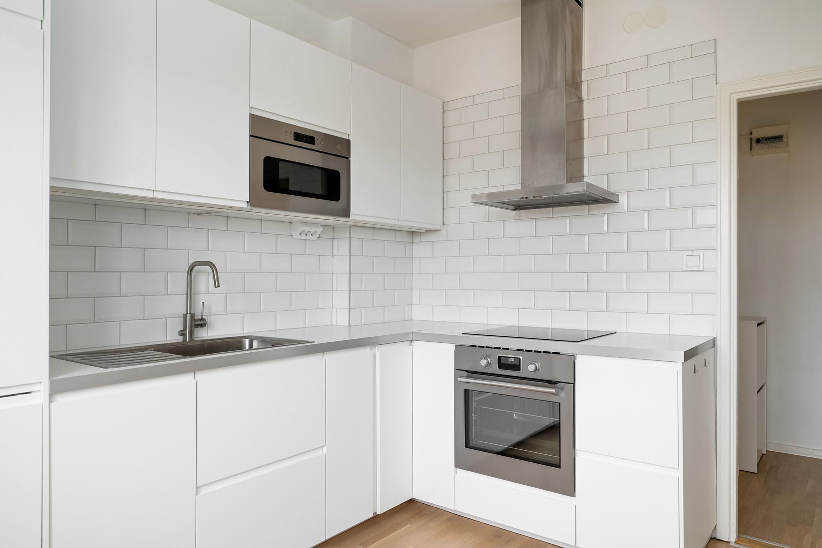 Det nyare och fräscha köket går i ljusa toner och erbjuder goda arbetsytor, bra förvaring samt diskmaskin. Här finns även plats för matbord och stolar, vilket gör köket till en trevlig och funktionell samlingspunkt i vardagen.