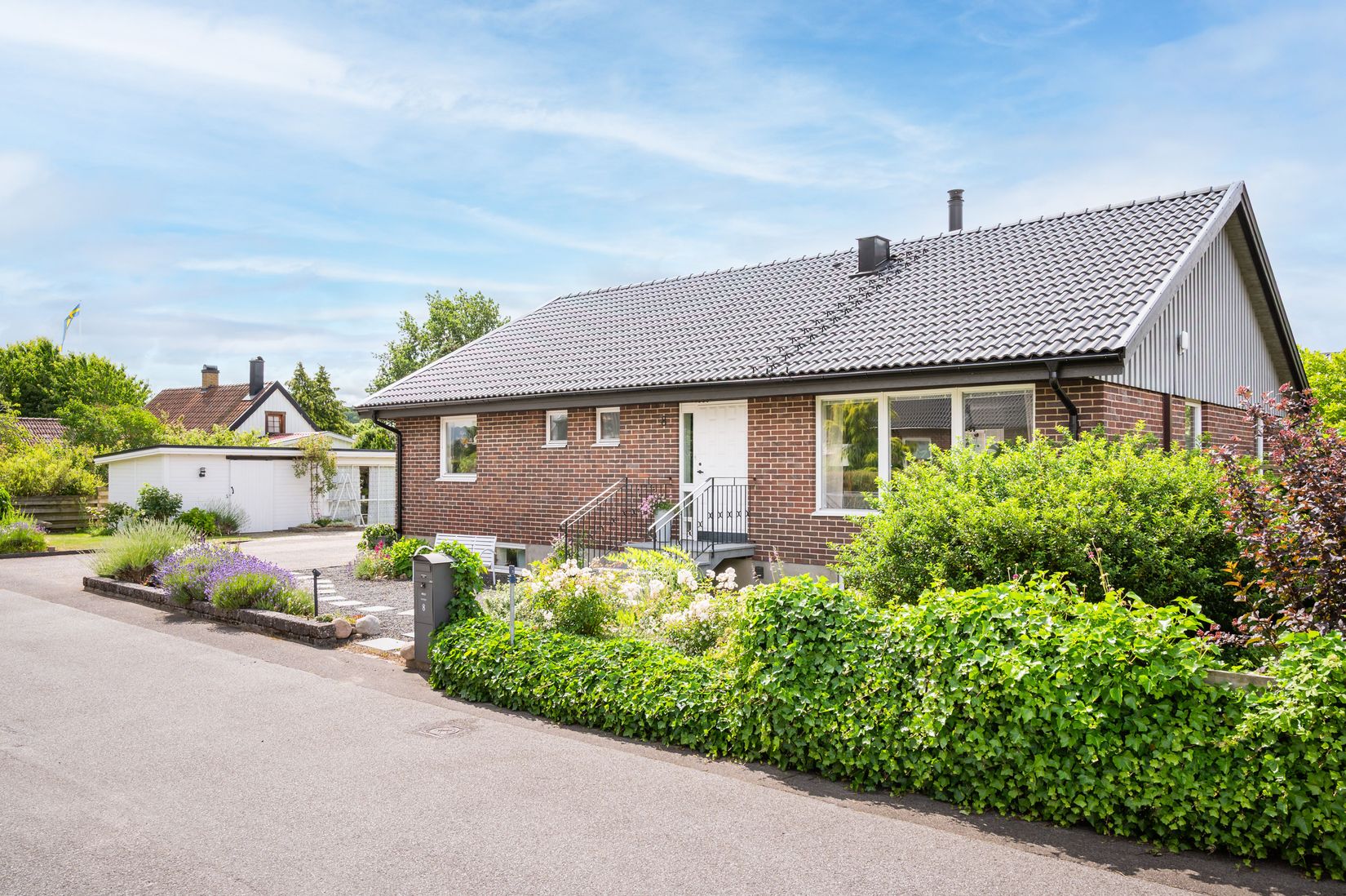 För barn finns gungställning, lektorn och sandlåda. En friggebod kan användas som lekstuga eller förvaring. Två trädäck ger flexibilitet för olika behov och tider på dagen. Attefallshuset om cirka trettio kvadratmeter är tvådelat och erbjuder goda förvaringsmöjligheter för cyklar och trädgårdsredskap samt extra utrymme för olika ändamål. Garage och rymlig uppställningsplats ger god plats för fordon och förvaring.