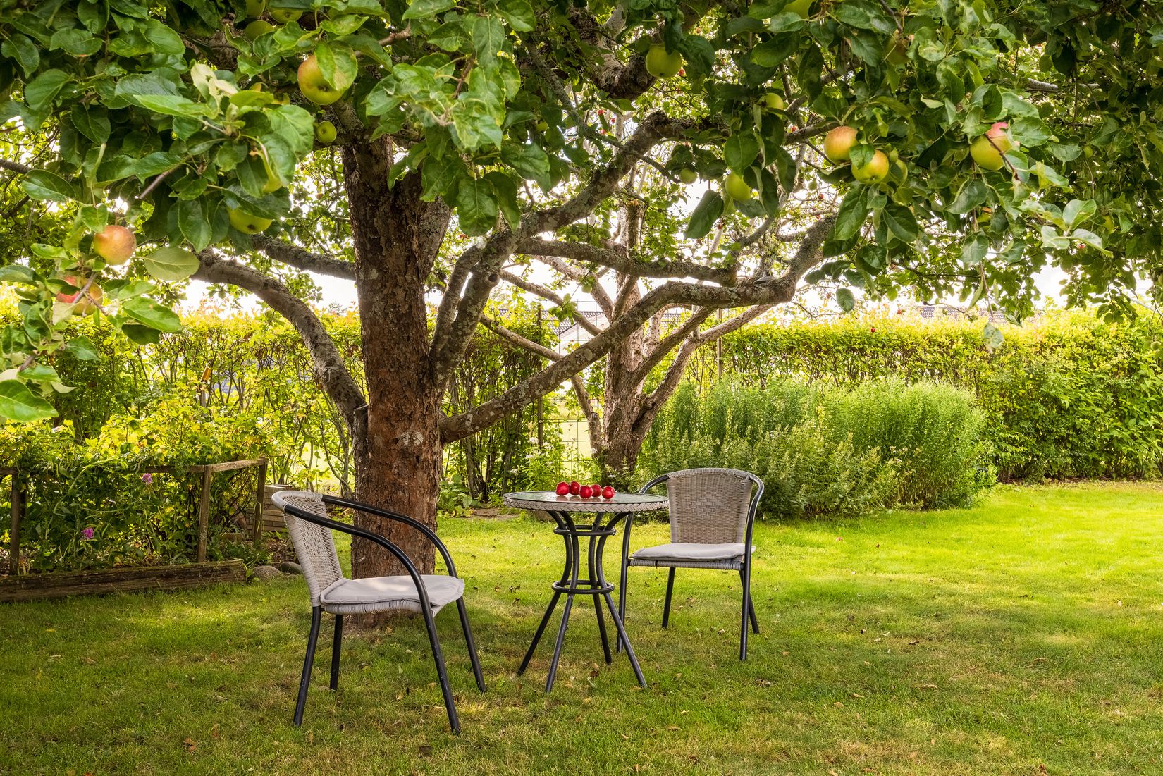 Hemtrevlig familjevilla med en underbar trädgård. Här kan ni njuta av tillvaron medan ni tar hand om äppelträd, bärbuskar och planteringar. Det finns även en vindskyddad uteplats där ni kan ha utemöbler och grill. Den inglasade verandan förlänger säsongen på hösten och här finns plats för stora blomkrukor samt bord, stolar och soffa.