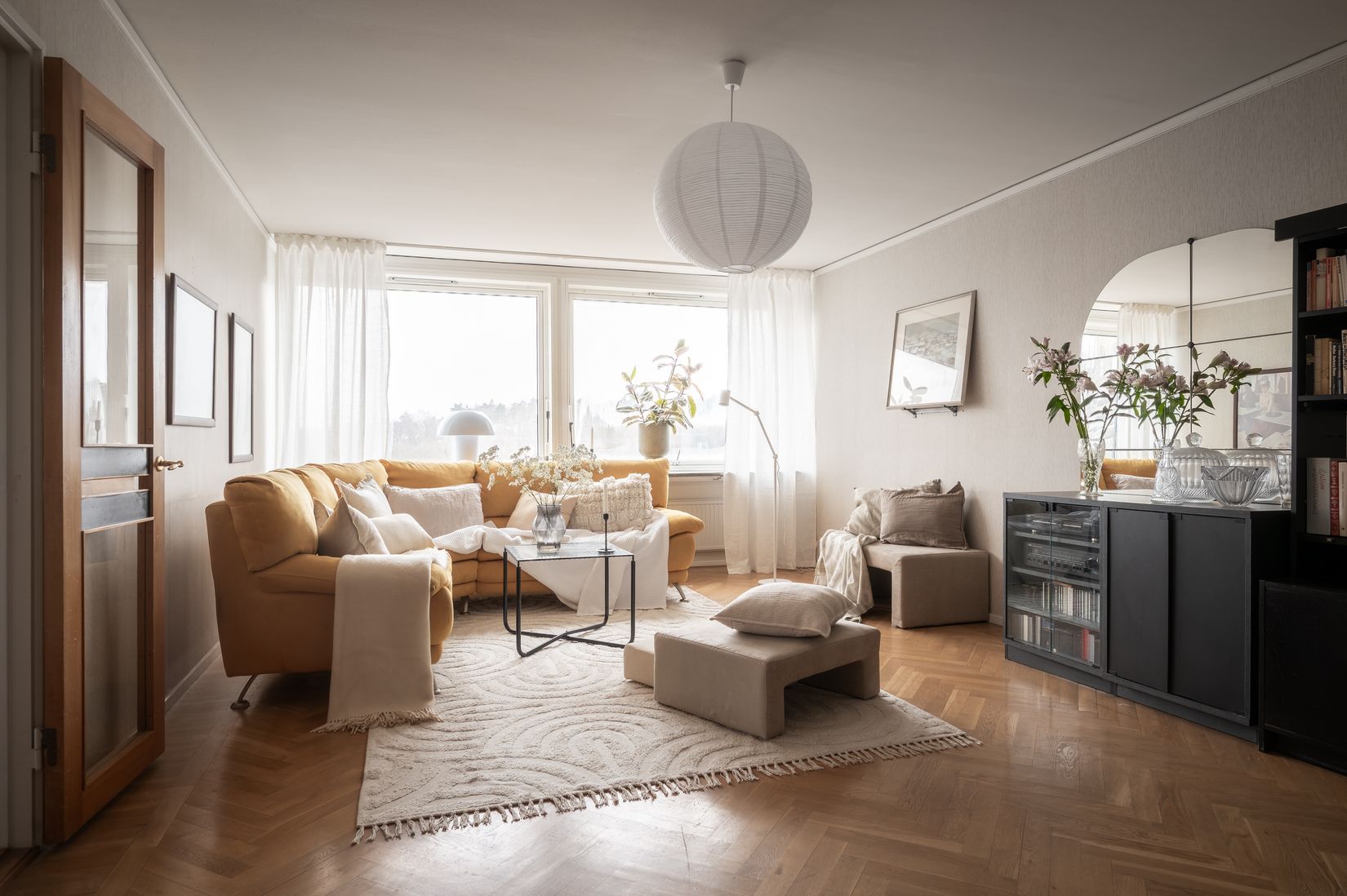 I ett rofyllt och grönskande kvarter, bara en kort promenad från stadens pulserande utbud, finner ni denna charmiga 1960-talspärla - en sexrumslägenhet med bevarad tidsanda och ett oslagbart läge. Lägenheten välkomnar er med ljusa, lättmöblerade ytor där originaldetaljer som fiskbensparkett, gabondörrar, generös takhöjd och djupa fönsterbänkar i sten sätter tonen direkt. Lägenheten präglas av naturligt ljus tack vare stora fönsterpartier och dessutom får ni njuta av en grönskande utsikt. Förvaringsmöjligheterna är generösa med flera inbyggda garderober och praktisk klädkammare. Sovrummen är harmoniska och ger er alla förutsättningar till en god nattsömn. Sist men inte minst, den inglasade balkongen blir en perfekt plats att njuta av solen, kaffet och kvällarna, året om. Här bor ni ett lugnt och trivsamt område, där grönskan breder ut sig och fåglarnas kvitter hörs som allra vackrast.