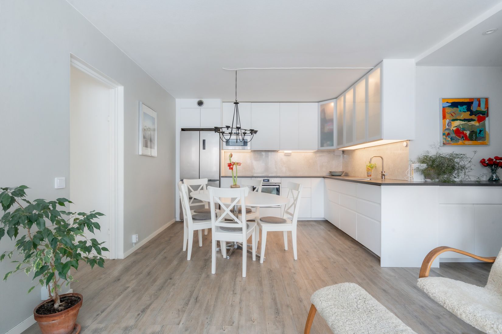 Köket som har öppen planlösning mot vardagsrummet är renoverat och håller en modern standard med goda arbetsytor och plats för matbord. Lägenheten har två helkaklade badrum, vilket ger hög komfort och underlättar vardagen. Det ena badrummet är utrustat med tvättmaskin och torktumlare. Golv och väggar är i fint skick och bidrar till ett enhetligt och väl omhändertaget intryck genom hela bostaden.