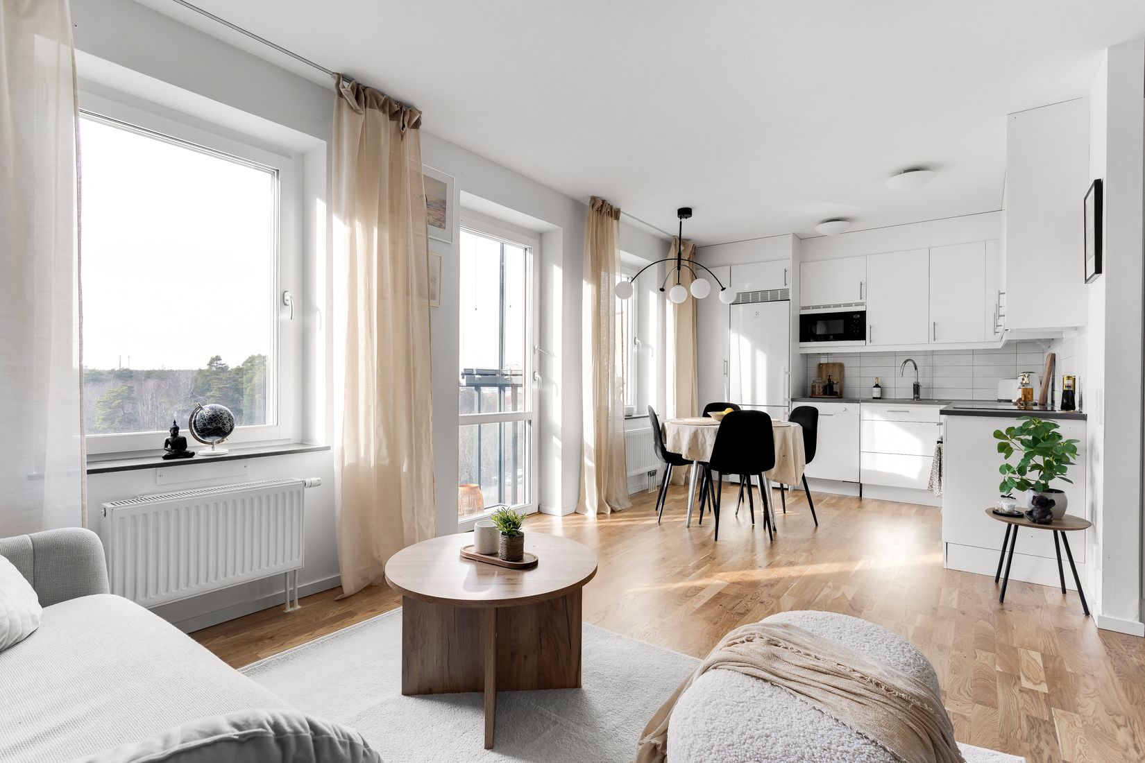 Stilsäkert och väl tilltaget kök från Vedum. De vita släta luckorna kombineras fint tillsammans med det vita stänkskyddet och den gråa arbetsbänken i laminat. Den maskinella utrustningen består av induktionshäll, diskmaskin, mikro i väggskåp, ugn samt kombinerad kyl/frys. Det här är verkligen ett kök som inbjuder till umgänge med familj och vänner. Här går det med enkelhet att bjuda in till middag för flertalet gäster runt matbordet, precis in till det stora fönsterpartiet med härlig utsikt. Vidare i bostaden möts vi av ett strålande ljusinflöde i det sociala sällskapsrummet som erbjuder flera olika alternativ för möblemang. Låt fantasin flöda och skapa ditt drömhem. Här finns det gott om plats för soffgrupp, tillhörande soffbord, rymlig matplats och separat sovrum med plats för 1,40 säng och sängbord.