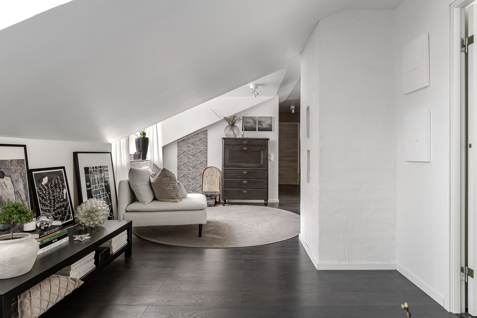 Redan när du kliver in i hallen väcks nyfikenheten till liv då man genast får kontakt med vardagsrummet där ljuset flödar in från fönstren i takkuporna. Lägenheten rymmer ett väl tilltaget och fullutrustat kök med matplats, ett luftigt vardagsrum med fina sällskapsytor, ett mysigt sovrum med plats för dubbelsäng och ett fräscht, helkaklat badrum. Genomgående för hela bostaden är att det är en fantastisk rogivande känsla med det höga läget och den privata, insynsbefriade miljön som det innebär att bo högst upp i huset. Invändigt präglas bostaden av en modern, harmonisk interiör med enhetliga golv och stilfulla materialval. En påtaglig trivselkänsla som gör sig påmind i varje vrå. Ett bekvämt boende i hus med hiss, dessutom finns både diskmaskin och tvättmaskin som bidrar med extra komfort i vardagen.