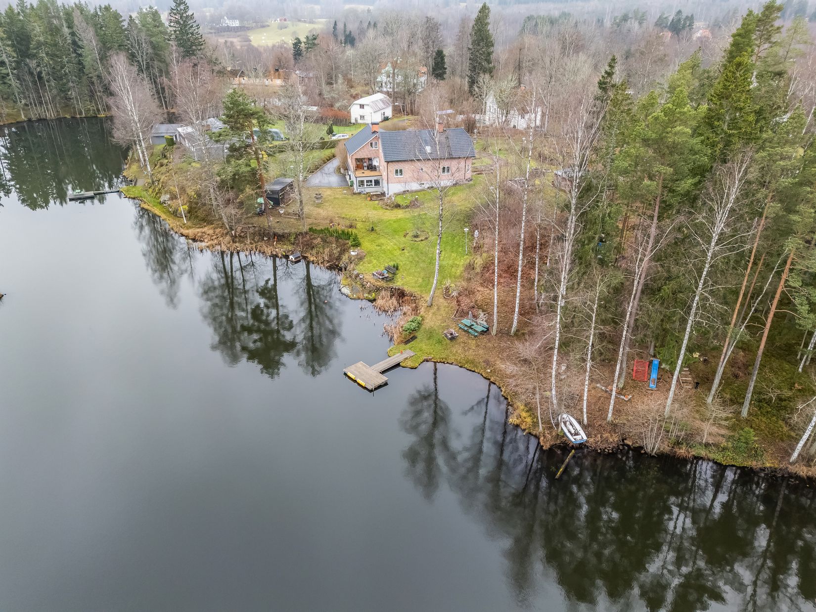 Här väntar en fantastisk sjötomt med egen brygga, ett generöst poolområde samt både öppna gräsytor och naturskön skog på den stora tomten. En privat liten sjö ger dessutom fastigheten en extra exklusiv och rogivande dimension.