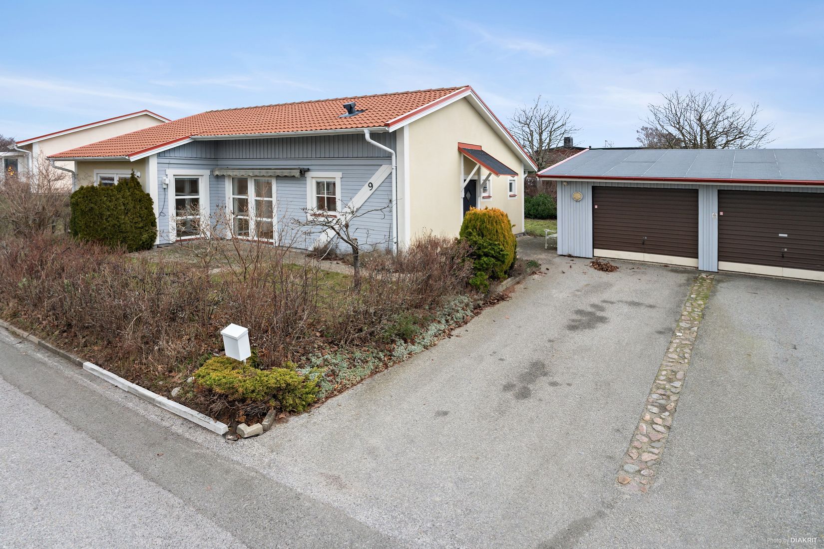 Lummig trädgård med gräsmatta och växtlighet som omgärdar. Stensatt vid entrén och in mot trädgård. Asfalterad uppfart med plats för en bil. Det är en välskött förening och ett plus är det gemensamma föreningshuset som kan nyttjas av medlemmarna för fest eller för att hyra till långväga gäster.