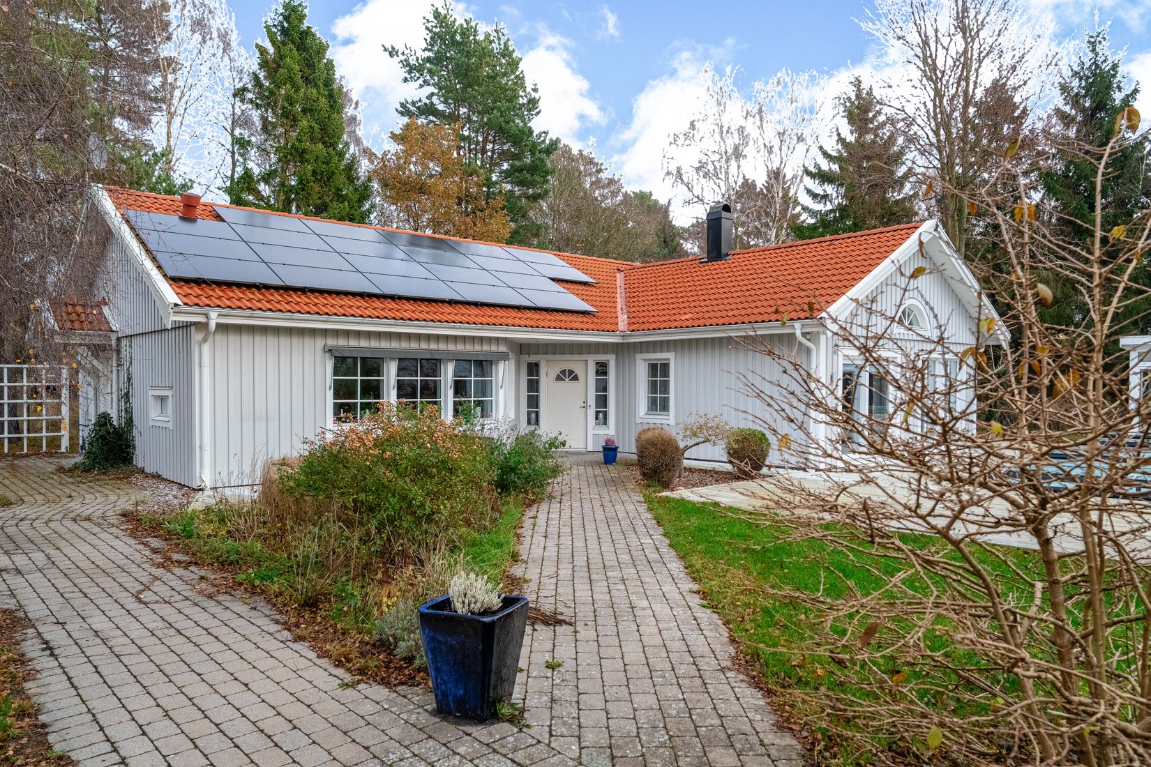 På natursköna Ringbovägen 6 väntar denna underbara enplansvilla med solceller som erbjuder både avskildhet, elegans och ett hem att trivas i året runt. Här bor du inbäddad i grönska med en sällsynt harmonisk atmosfär. Bostaden omfattar 166 kvm boyta samt 38 kvm dubbelgarage, och tomten om hela 1 597 kvm bjuder på gott om utrymme för både avkoppling och aktivitet. Utomhusmiljön är minst lika imponerande som insidan. Här finns ett stort altandäck med flera utgångar, ett insynsskyddat poolområde och ett generöst poolhus/uterum med glasdörrar – perfekt för avkoppling, middagar och umgänge från tidig vår till sen höst. Tomten är underbart lummig och området barnvänligt och lugnt!