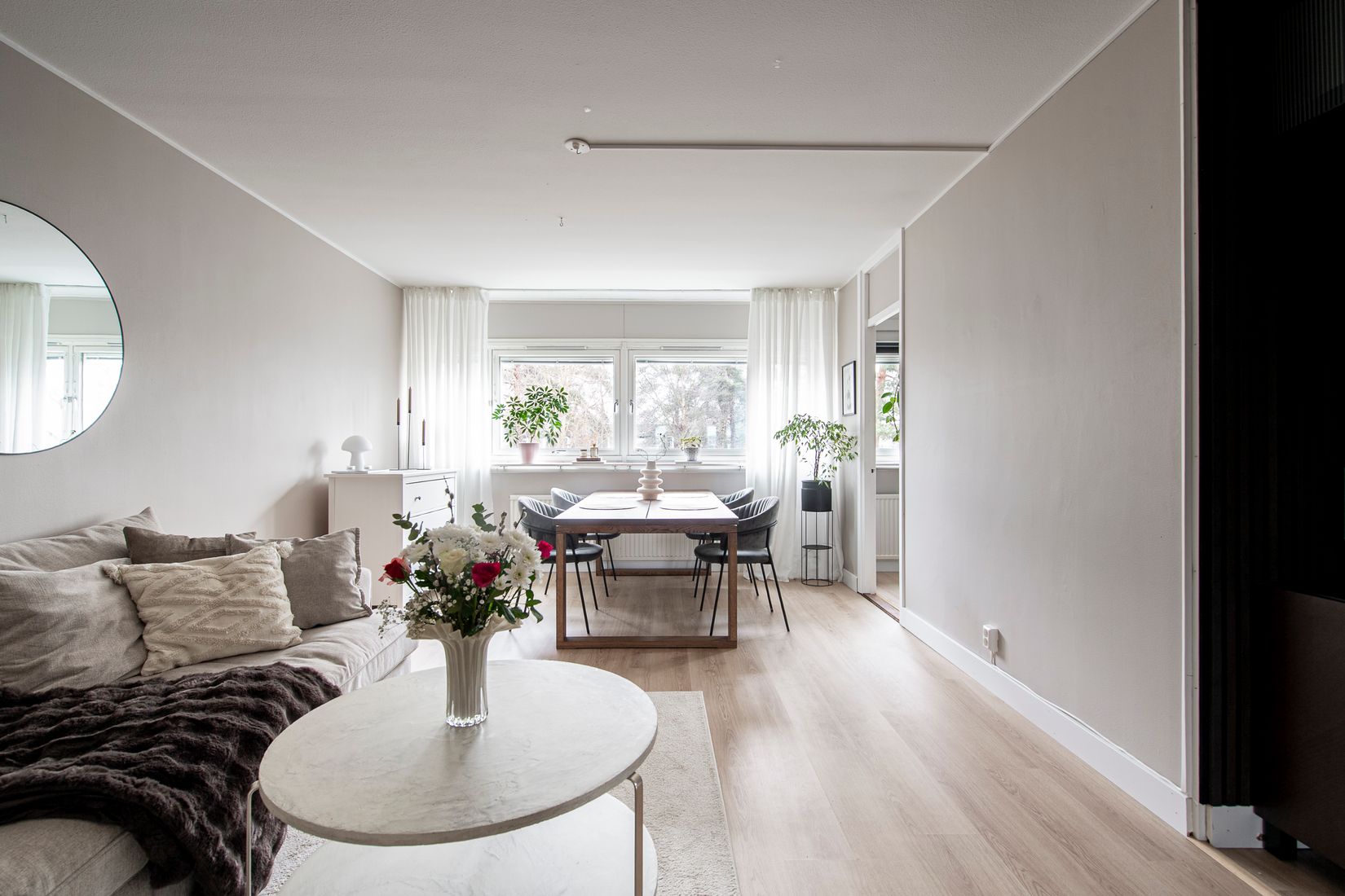 Vardagsrummet är luftigt och lättmöblerat med gott om plats för både soffgrupp och matmöblemang. De stora fönsterpartierna bidrar till ett härligt ljusflöde och skapar en harmonisk miljö för umgänge och avkoppling.