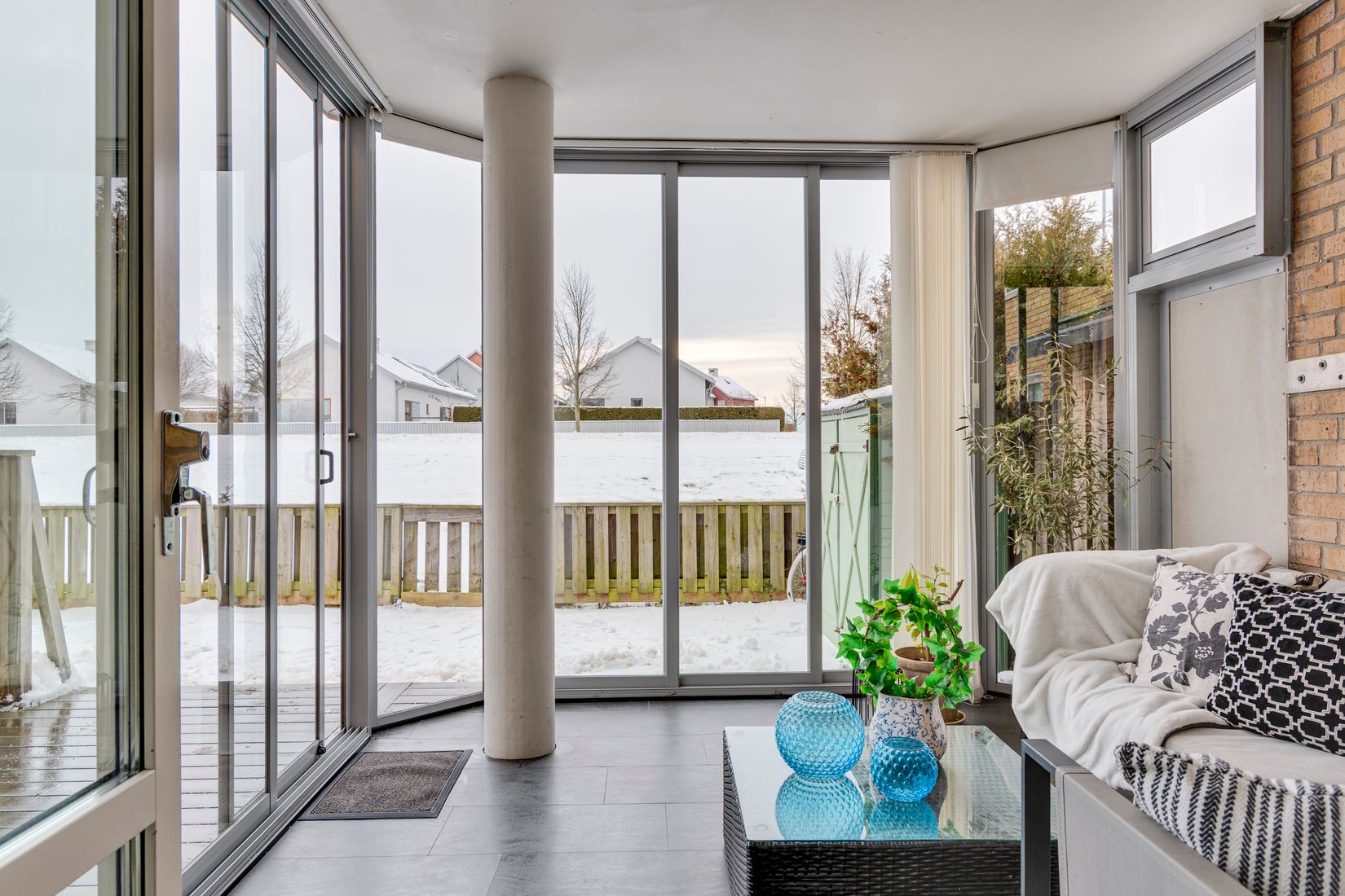 Bostaden erbjuder ett ljust och luftigt vardagsrum med gott om plats för både soffgrupp och matsalsmöblemang. Härifrån når du den stora uteplatsen, där en del är inglasad, perfekt för att njuta av säsongen lite längre och skapa en härlig plats för både middagar och avkoppling.