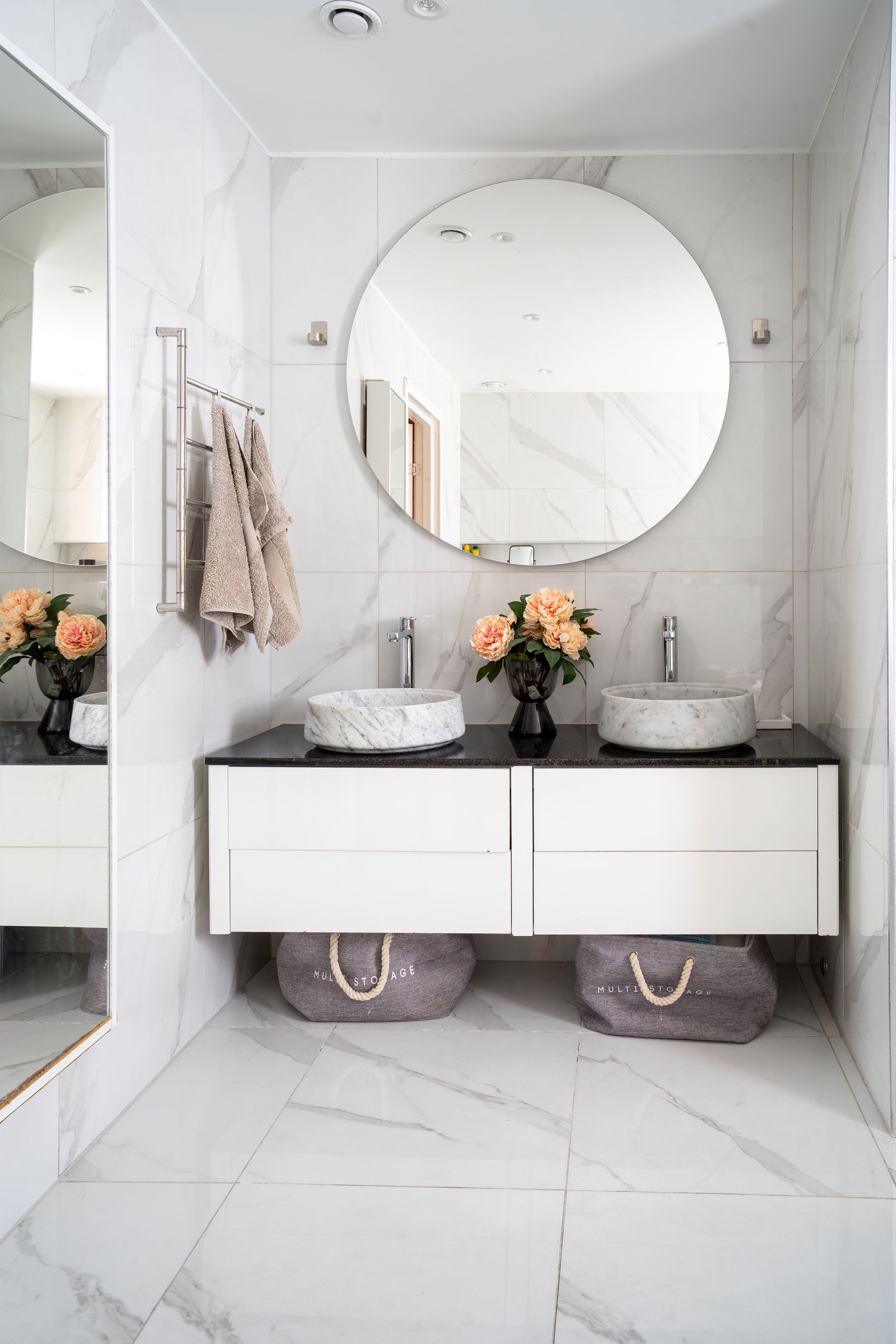 Två helkaklade badrum + tvättstuga och torkrum i stilren design.