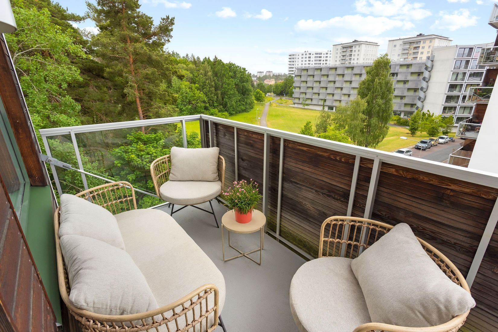 Denna charmiga trea erbjuder ett fantastiskt hörnläge intill grönskande allmänning och en fri utsikt mot det öppna fältet i sydväst. Här får du en rymlig balkong i soligt västerläge där du kan njuta av kvällssolen och den vackra omgivningen. Bostaden ligger högt upp på fjärde våningen, med hiss i huset och möjlighet till garageplats i källaren. Läget är perfekt – bara fem minuter till tunnelbanan och nära till allt du behöver.