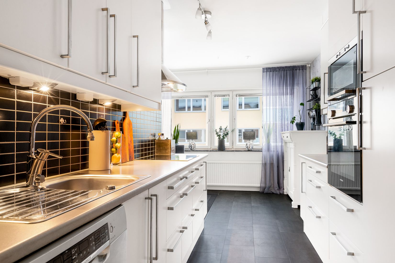 Det renoverade köket är både stilrent och funktionellt med vita köksluckor och full maskinell utrustning i form av diskmaskin, inbyggd mikro och ugn samt induktionshäll. Längre in i köket finns generöst med plats för ett matbord för 6–8 personer, vilket gör köket till en naturlig samlingspunkt.