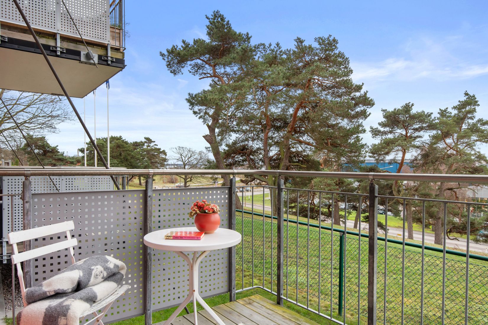 Invändigt möts du av en ljus och stilren interiör med moderna materialval. Den öppna planlösningen mellan kök och vardagsrum skapar en luftig och social yta, och härifrån nås även lägenhetens balkong i soligt söderläge. Balkongen erbjuder ett fritt och rogivande läge med utsikt över området.