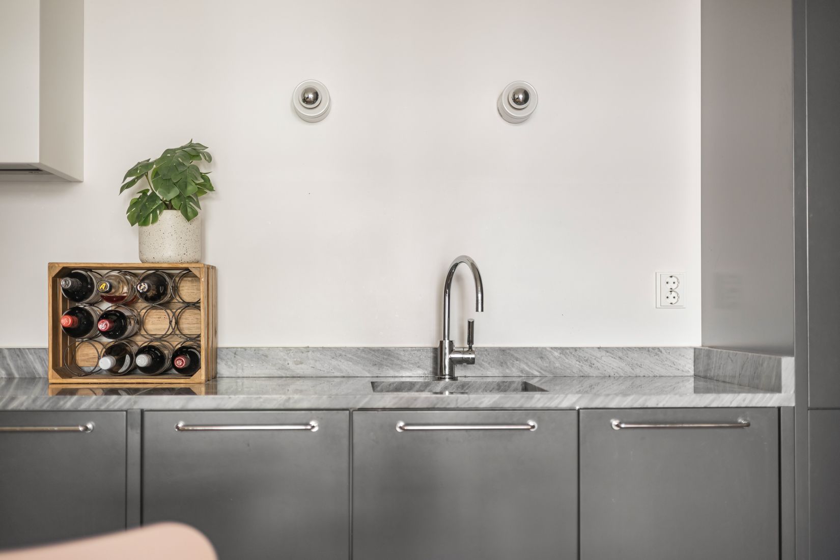 Köket är smakfullt utformat med bra arbetsytor och förvaring, perfekt för både vardag och middagar med vänner. Specialritat kök med vackra detaljer i krom, släta luckor i en antracitgrå kulör och bänkskivor i marmor. Genomgående ekparkettgolv. Badrummet är smakfullt inrett med matt mosaikgolv, rektangulärt vitt kakel på väggarna samt målat innertak i antracitgrå kulör. Dusch, golvvärme och handdukstork samt tvättmaskin och torktumlare finns. Sovrummet är rofyllt och rymligt med plats för dubbelsäng och tillhörande möbler samt förvaring.