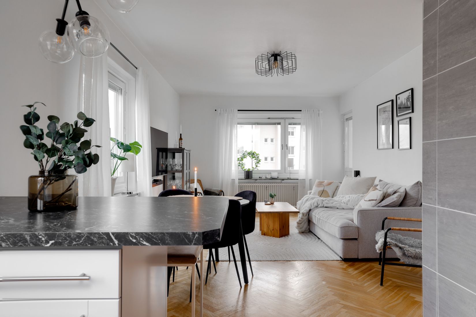Vardagsrummet är lättmöblerat och rymmer utan problem både soffgrupp och matplats, i vardagsrummet ligger en charmig fiskbensparkett som ger karaktär och en varm känsla till rummet. Härifrån nås även balkongen som har plats för såväl loungegrupp som ett mindre bord med stolar, en perfekt plats för både morgonkaffet och sommarkvällar.