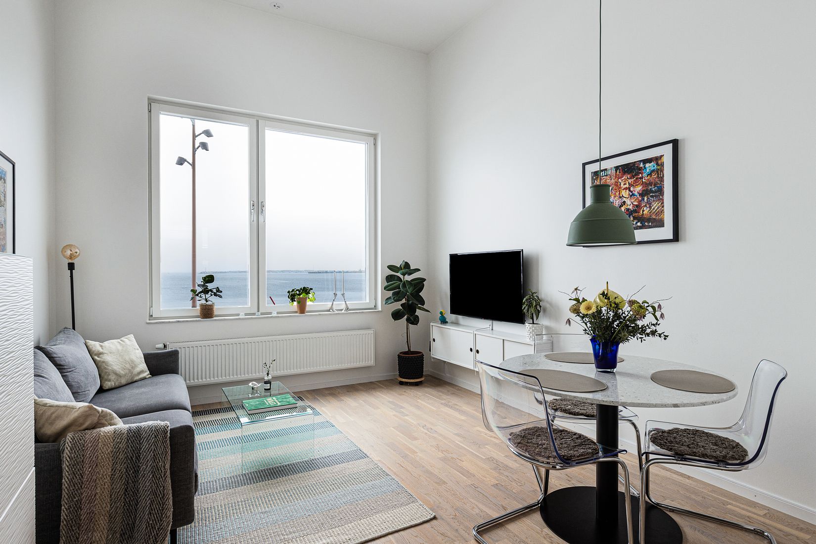 Vardagsrummet präglas av ett fantastiskt ljusinsläpp från det generösa glaspartiet mot havet. Takhöjden om hela 3,8 meter skapar en imponerande rymd och ger bostaden en tydlig wow känsla. Köket är stilrent utformat och utrustat med vinkyl vilket gör det lika funktionellt som inbjudande.