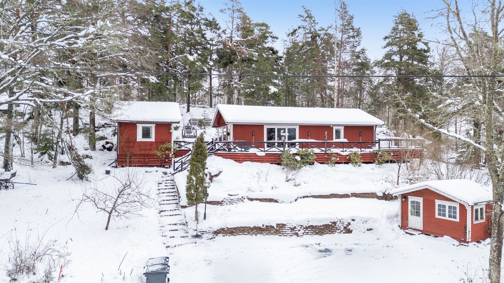 Verandan bereder ut sig i alla fyra väderstreck. Vid den södra delen finns möjlighet att sitta många samlade. Fastigheten ligger vackert soligt belägen. Intill huset finns en gäststuga. Infarten rymmer 3-4 bilar och avslutas med en förrådsdel. Den samlade boytan ligger på c:a 118 m² fördelade på 86 + 32 m². Den större huvudbyggnaden har 3 rum och kök. Gäststugan innefattas av hall/allrum, sovrum, bastu och badrum.
