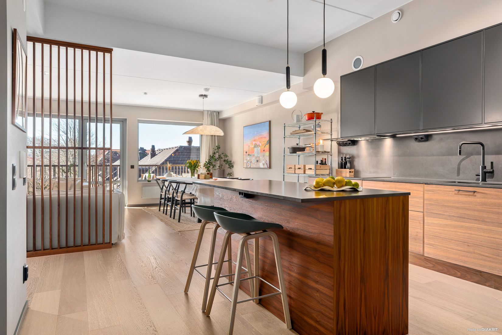 Köket från Länghems kök är fullutrustat, påkostat och en dröm för matälskare. Här finns en stilren köksö och en inbyggd vinkyl som ger en extra touch av lyx och blir en given plats för minglande gäster. I lägenheten finns även Plejd installerat i takbelysningen på balkongerna samt i bostaden (exklusive badrum och gästtoalett). Detta ger dig möjlighet att styra belysningen via din telefon.