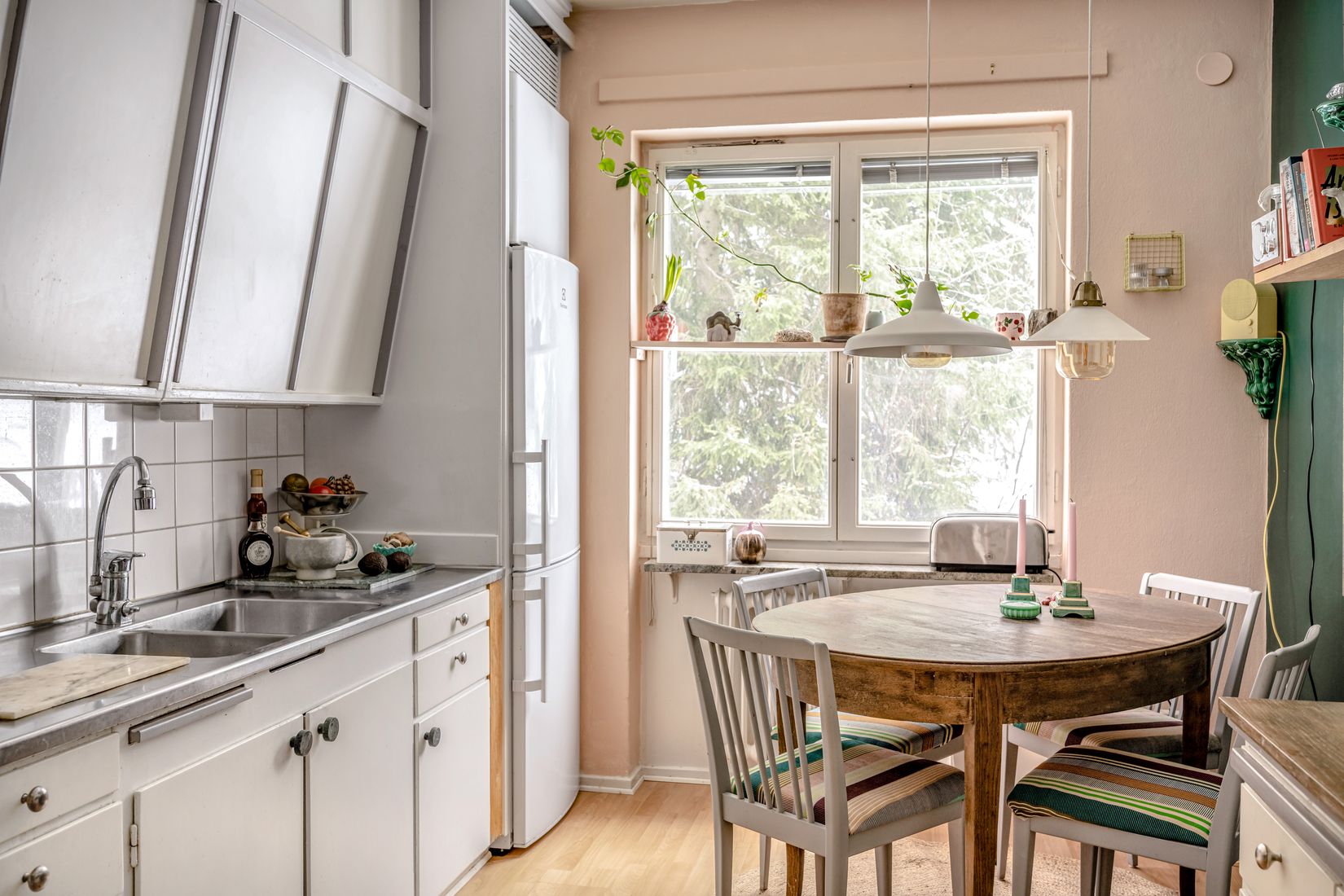 Vardagsrummet är rymligt och socialt med stort fönsterparti och utgång till den västervändabalkongen med kvällssol, vilket skapar en naturlig förlängning av boendeytan. Köket bjuder på gott om förvaring, bra arbetsytor och en självklar matplats vid fönstret. Sovrummet ligger lugnt mot skogspartiet och erbjuder bra förvaringsmöjligheter tack vare originalgarderober samt ett svalt nordöstläge som uppskattas under sommaren. Badrummet har fönster, badkar och kaklade väggar – charmigt och funktionellt. Hallen binder ihop rummen med god yta för avhängning och förvaring.