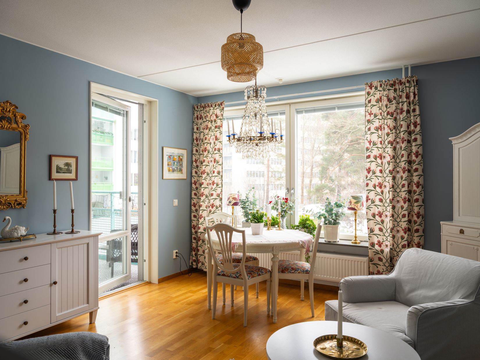 Från vardagsrummet nås den härliga balkongen med ogenerat läge mot parken, en självklar plats för morgonkaffet, avkoppling eller långa sommarkvällar i grönskande miljö.