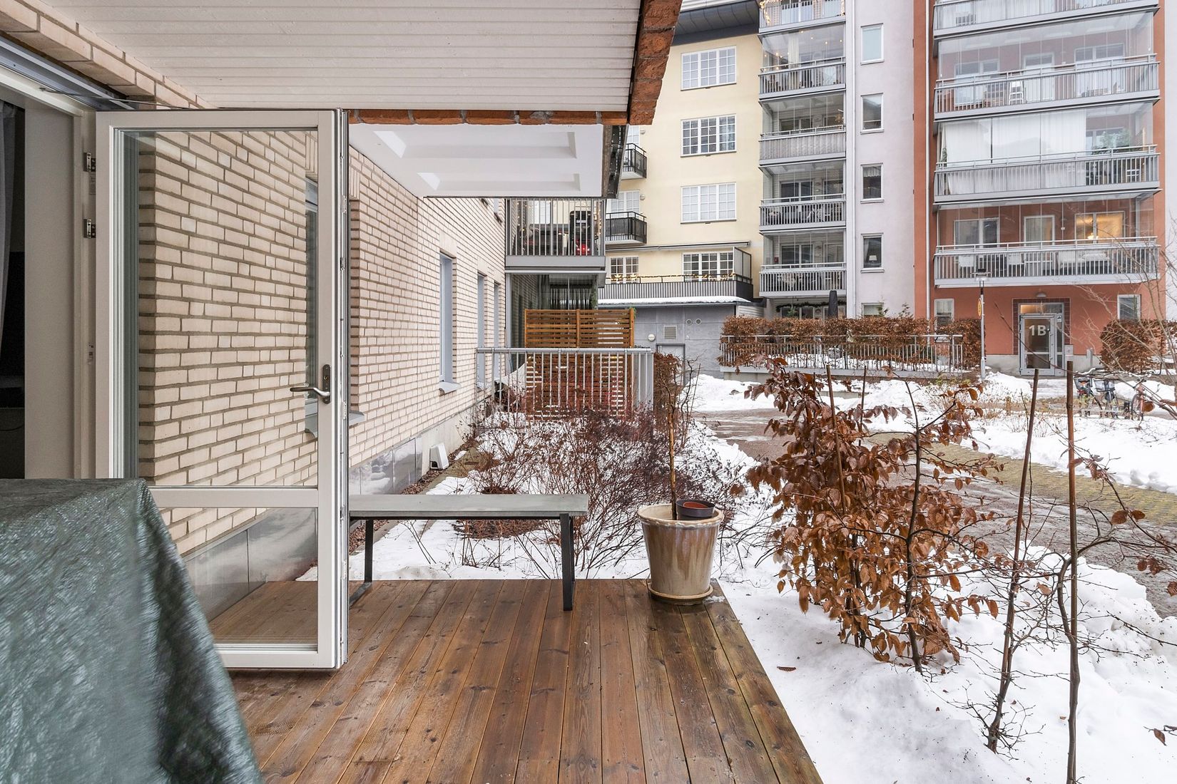 Kök och vardagsrum binds samman av en elegant bardel som skapar en social mittpunkt i bostaden. Den öppna planlösningen ger gott om utrymme för både umgänge och vardagsliv, med plats för såväl soffhörna som matplats. Från vardagsrummet nås den rymliga uteplatsen mot innergården – en lugn och privat oas som förlänger boendet under stora delar av året.