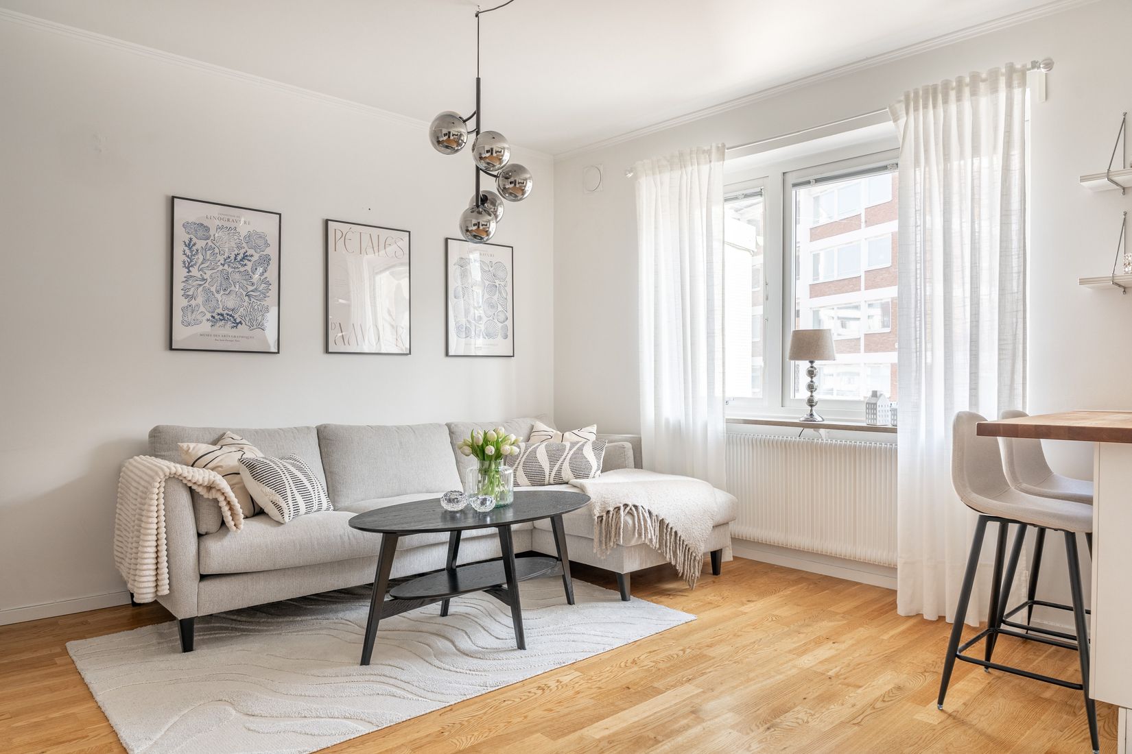 Den smart placerade sovalkoven ger lägenheten en nästan hotellinspirerad karaktär och skapar en naturlig uppdelning mellan vila och umgänge – ett eget litet sovrum där sängen får sin självklara plats utan att ta över rummet.