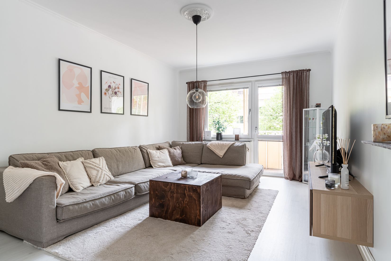 Lägenheten erbjuder ett ljust och rymligt kök i stilren design, med vita luckor, vitrinskåp och kaklad vägg. Köket är utrustat med diskmaskin, kyl/frys, spis och ugn. Intill det stora fönstret finns en naturlig matplats. Vidare finner du ett generöst vardagsrum med gott om plats för soffgrupp, tv-möbel och socialt umgänge. Rummet är lugnt och harmoniskt med målade trägolv, neutrala väggar och stora fönster som släpper in rikligt med dagsljus. Härifrån nås även bostadens balkong med fint solläge.