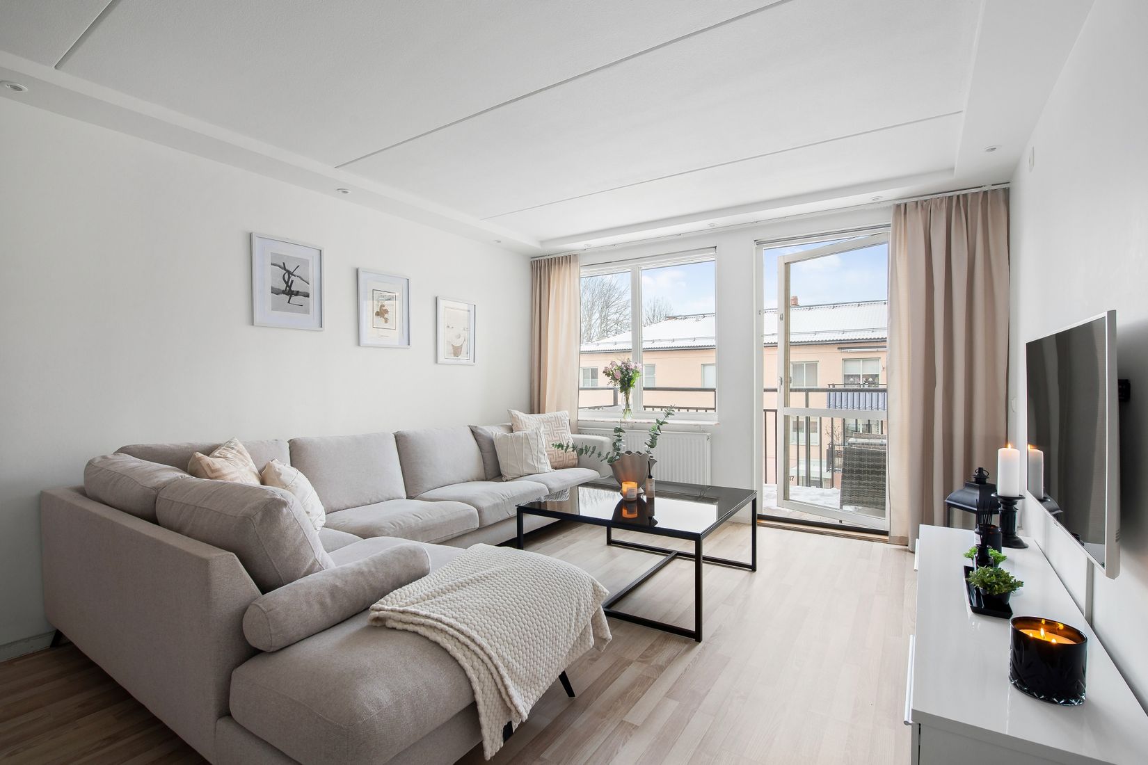 Bostaden erbjuder ett stort och fullt utrustat kök med diskmaskin, gott om arbetsytor och plats för ett större matbord. Det rymliga sovrummet rymmer enkelt en stor dubbelsäng och erbjuder utmärkta förvaringsmöjligheter tack vare platsbyggda garderober. I anslutning till hallen finns ett extra rum som idag används som kontor, men som lika bra kan nyttjas som sovrum, förråd eller bibliotek. Vardagsrummet är luftigt och lättmöblerat med flera möjliga möbleringslösningar. Från vardagsrummet finns du även utgången till den stora balkongen där du kan njuta av solen från lunch till sen kväll. Badrummet är helkaklat och förberett för enkel installation av tvättmaskin.