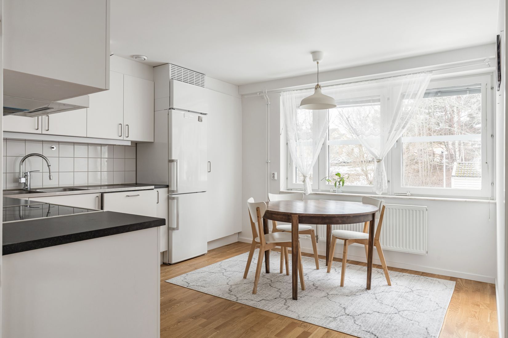 Här möts du av en rymlig hall med goda avhängningsmöjligheter och praktisk förvaring i garderober. Vidare in i bostaden väntar ett ljust och trevligt vardagsrum med stora fönsterpartier som skapar en härlig rymd och ger gott om plats för både soffgrupp och övrigt möblemang. Köket är både ljust och funktionellt med plats för matgrupp, vilket gör det enkelt att samla familj och vänner. Här finns bra arbetsytor och gott om förvaring. Sovrummet är hemtrevligt och rogivande med plats för säng, nattduksbord och extra förvaring, och ett stort fönster som släpper in rikligt med dagsljus. Badrummet är rymligt och praktiskt med badkar och dusch samt tvättmaskin. Genomgående vitmålade väggar och ekparkett skapar en ljus och neutral bas att inreda efter egen smak. Ett hem som passar perfekt för dig som söker ett välplanerat boende med bra ytor och en trivsam känsla.