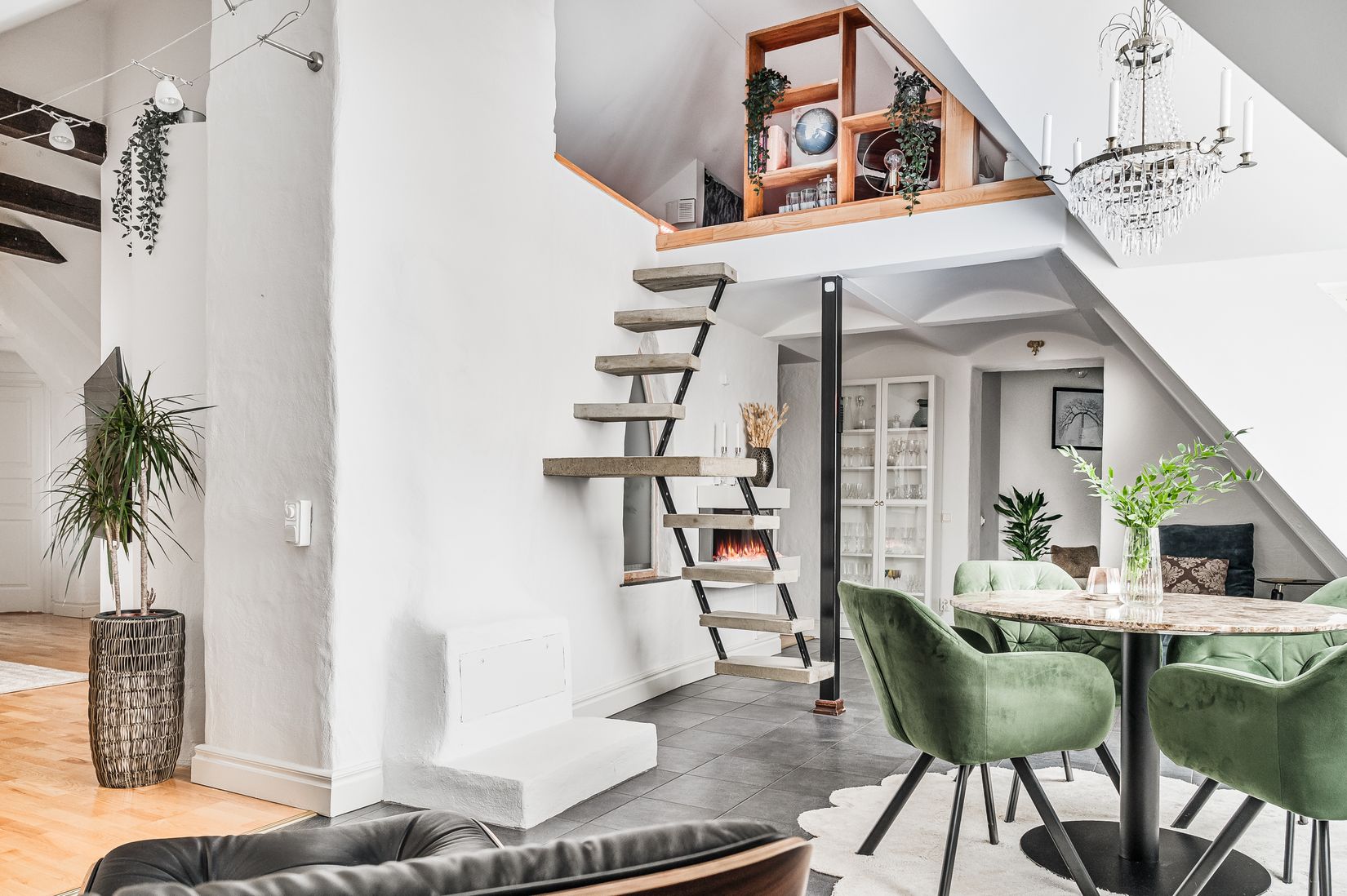 Här bor man i en unik våning med gott om förvaring samt härliga vrår och kanter som skiljer sig från "den klassiska" lägenheten. Bostaden erbjuder gott om sällskapsytor och exklusiva detaljer. Det är de smådetaljerna som avgör om detta kan bli just ditt drömhem! Utöver de vackra detaljerna finns ett slittåligt badrum, unikt kök med intilliggande matsal som ger gott om plats för hela familjen, två loft samt två väl tilltagna sovrum.