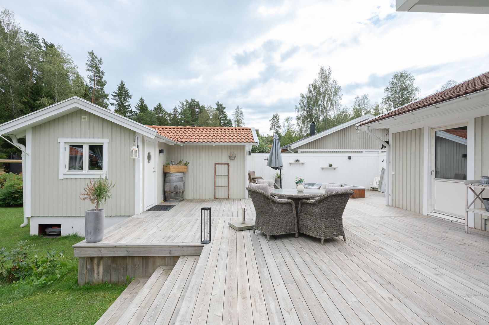 Trädgården är minst lika inbjudande som huset. Ett generöst trädäck binder samman bostaden med bastubyggnaden och erbjuder många härliga platser i solen. Här finns även ett Hydropool-spabad med selfcleaner och plats för hela familjen, vackert inramat av stämningsfull belysning. Bastubyggnaden rymmer en egen relaxdel, separat wc och dusch samt en rymlig bastu, vilket gör den till en privat spa-oas. På tomten finns också en isolerad friggebod med snickarbänk som även kan användas som gästrum, en charmig lekstuga för de yngre och ett växthus. De plana gräsytorna gör trädgården både vacker och lekvänlig.