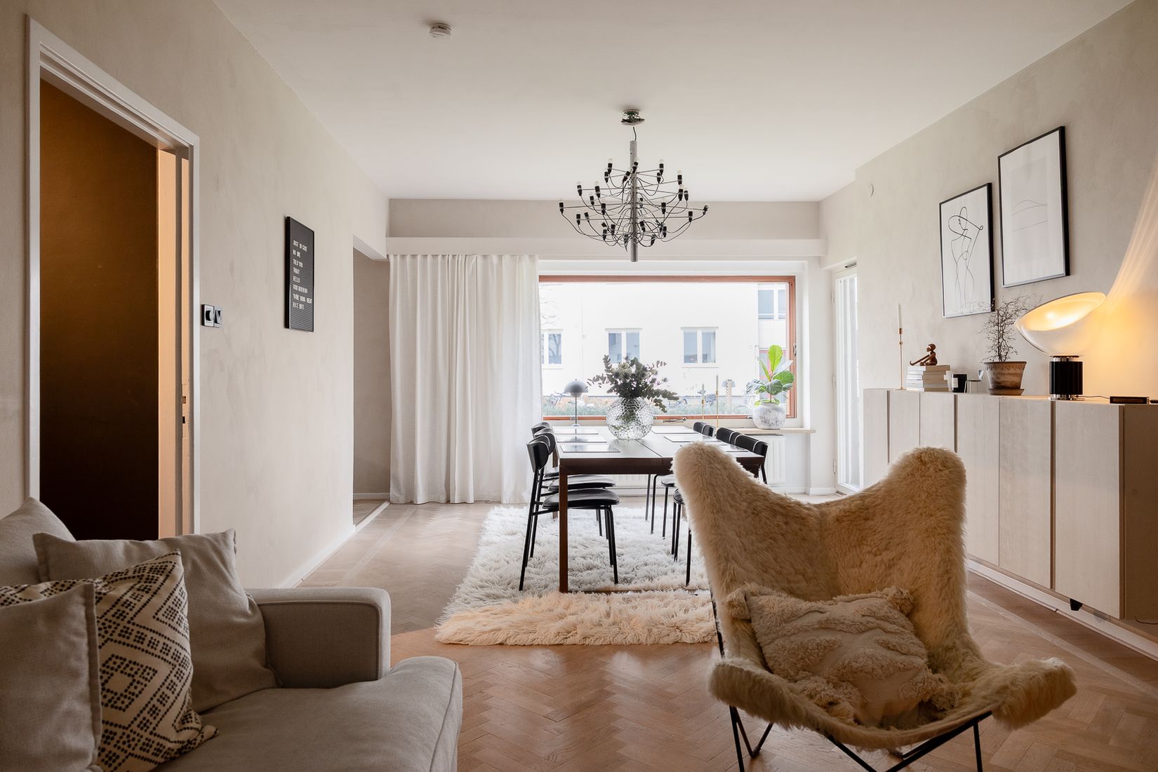 De generösa sällskapsytorna bjuder på vackert fiskbensmönstrat golv, stora fönsterpartier och en inbyggd vedkamin som skapar både värme och karaktär. Här finns gott om plats för såväl soffgrupp som matplats och med direkt access till balkongen suddas gränsen mellan ute och inne ut.