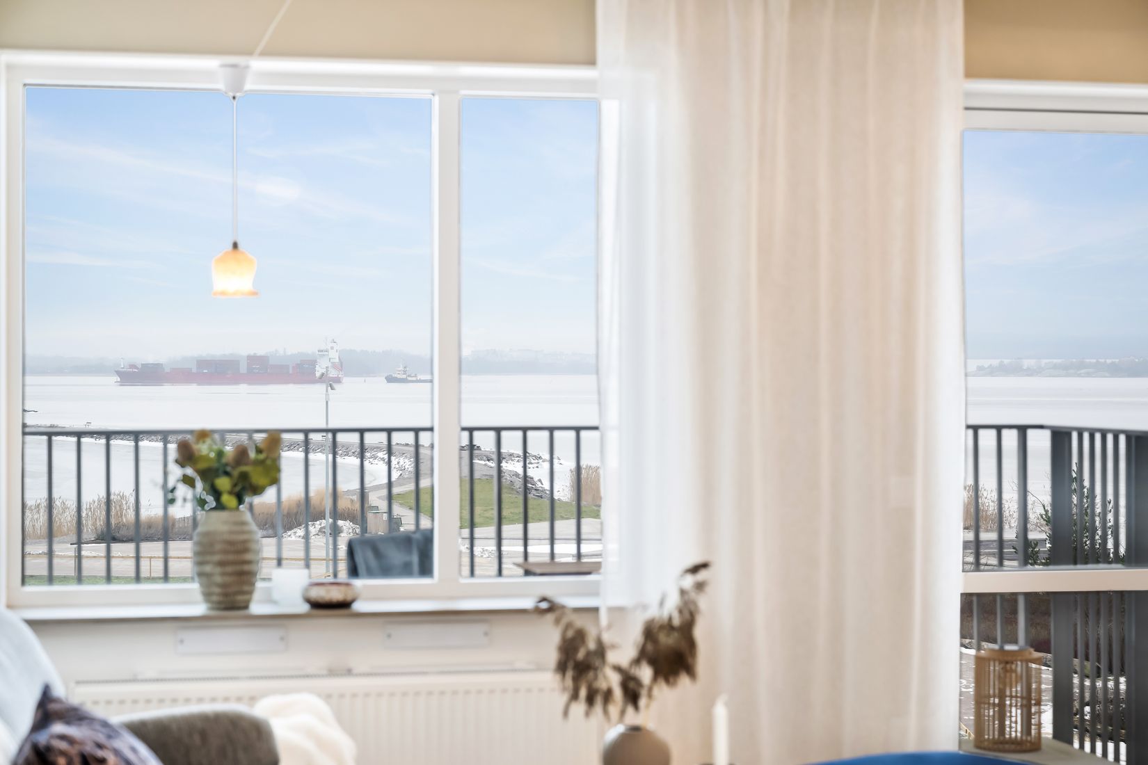 Den stora hörnbalkongen blir en naturlig förlängning av bostaden och bjuder på både morgon och kvällssol, en svårslagen plats för frukost i solen eller långa sommarkvällar med utsikten som sällskap.
