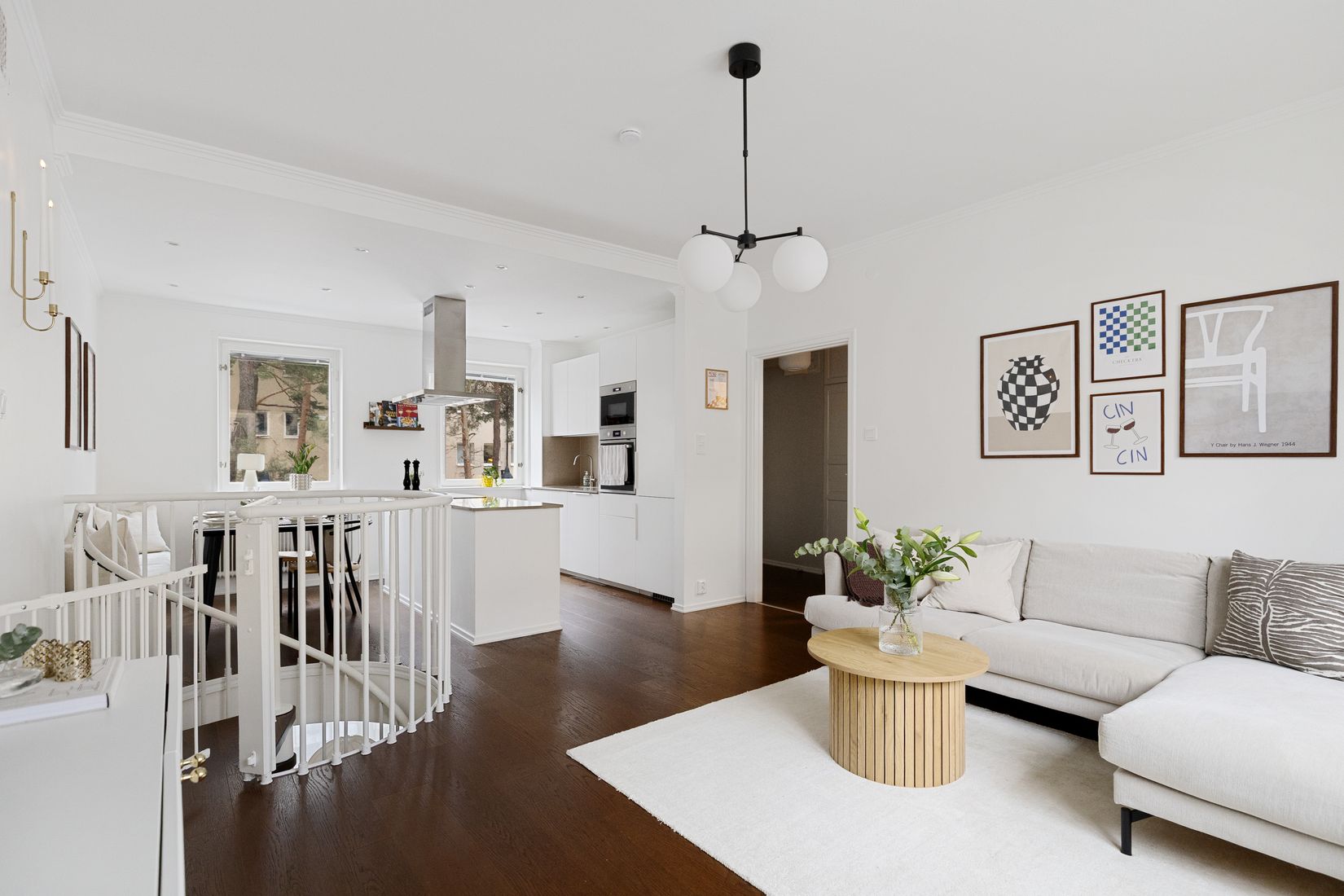 Interiört präglas bostaden av ljusa ytskikt, vackra golv och ett fint ljusinsläpp. På det övre planet finns kök och vardagsrum i en öppen och social planlösning där köket är utrustat med köksö, generösa arbetsytor och en inbjudande matplats i direkt anslutning. Vardagsrummet är luftigt och lättmöblerat med plats för både soffgrupp och umgänge.