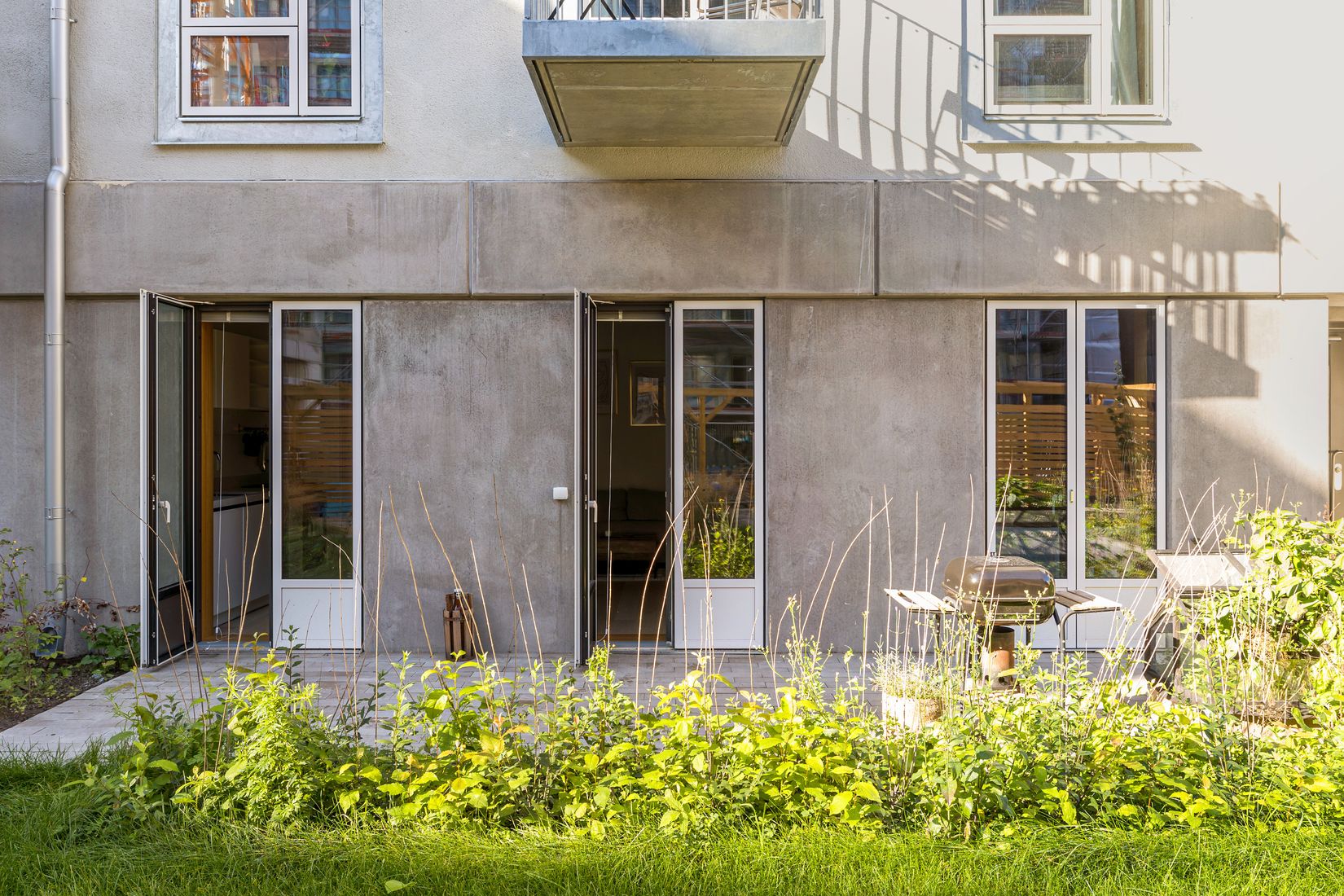 Du finner här ett modernt kök med stilrena vita luckor och väl tilltagen arbetsbänk i ljus sten. Här har säljaren även investerat i extra kökinredning vilket skapar ytterligare möjlighet till förvaring. Med grepplösa luckor och helintegrerade vitvaror följer köksinreningen den övriga moderna inredningsstilen. I allrummet finns gott om plats för både matbord och soffgrupp och det är även härifrån du når bostadens uteplats. Med två utgångar skapas stora möjligheter att avnjuta sommarmånaderna på uteplatsen. Det är en plattsatt uteplats som inrymmer både matplats och utrymme för grillen samtidigt som den ramas in på ett naturligt vis av grönska. Från allrummet når du även ett sovrum med gott om förvaring och med samma generösa takhöjd.