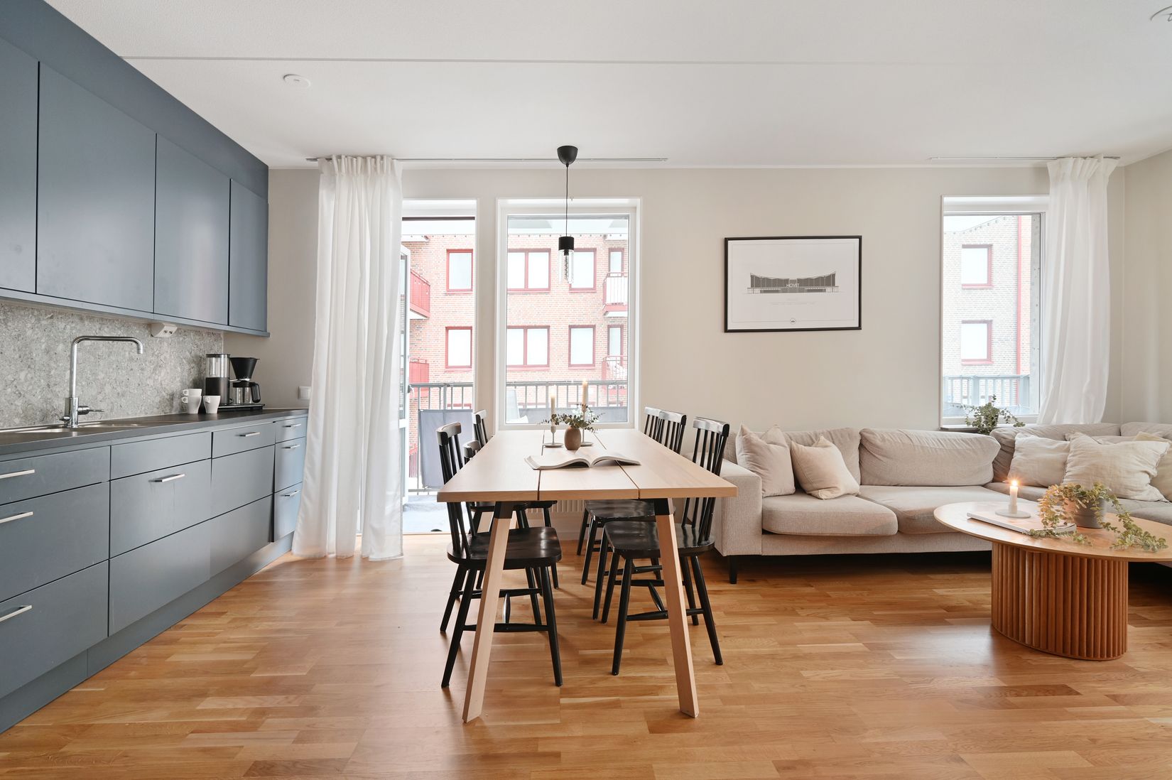 Här råder lagen om öppna ytor, och ni behöver knappt kliva in från trapphuset för att få en föraning om vad som väntar. Dagsljuset välkomnar er redan i den rymliga hallen, som erbjuder gott om plats för avhängning samt förvaring av hela familjens arsenal av ytterkläder, skor och prylar. Tar ni vägen rakt fram hinner ni passera det generösa duschrummet innan ni landar i ett välplanerat och trevligt sovrum med goda förvaringsmöjligheter i inbyggda garderober. Näst på tur finner ni bostadens andra sovrum som är ljust och lättmöblerat och ligger i nära anslutning till bostadens självklara medelpunkt, det sociala och trevliga köket i härligt öppen planlösning med det dagsljusbadande vardagsrummet. Köket är smakfullt inrett och erbjuder goda arbetsytor samt förvaring bakom stilrena luckor. Och med sin stora anslutande matplats gör det sig perfekt för det stora middagssällskapet. Chansen är god att ni blir kvar i lägenhetens nav en bra stund, innan det är dags att vandra vidare och inspektera den generösa balkongen.