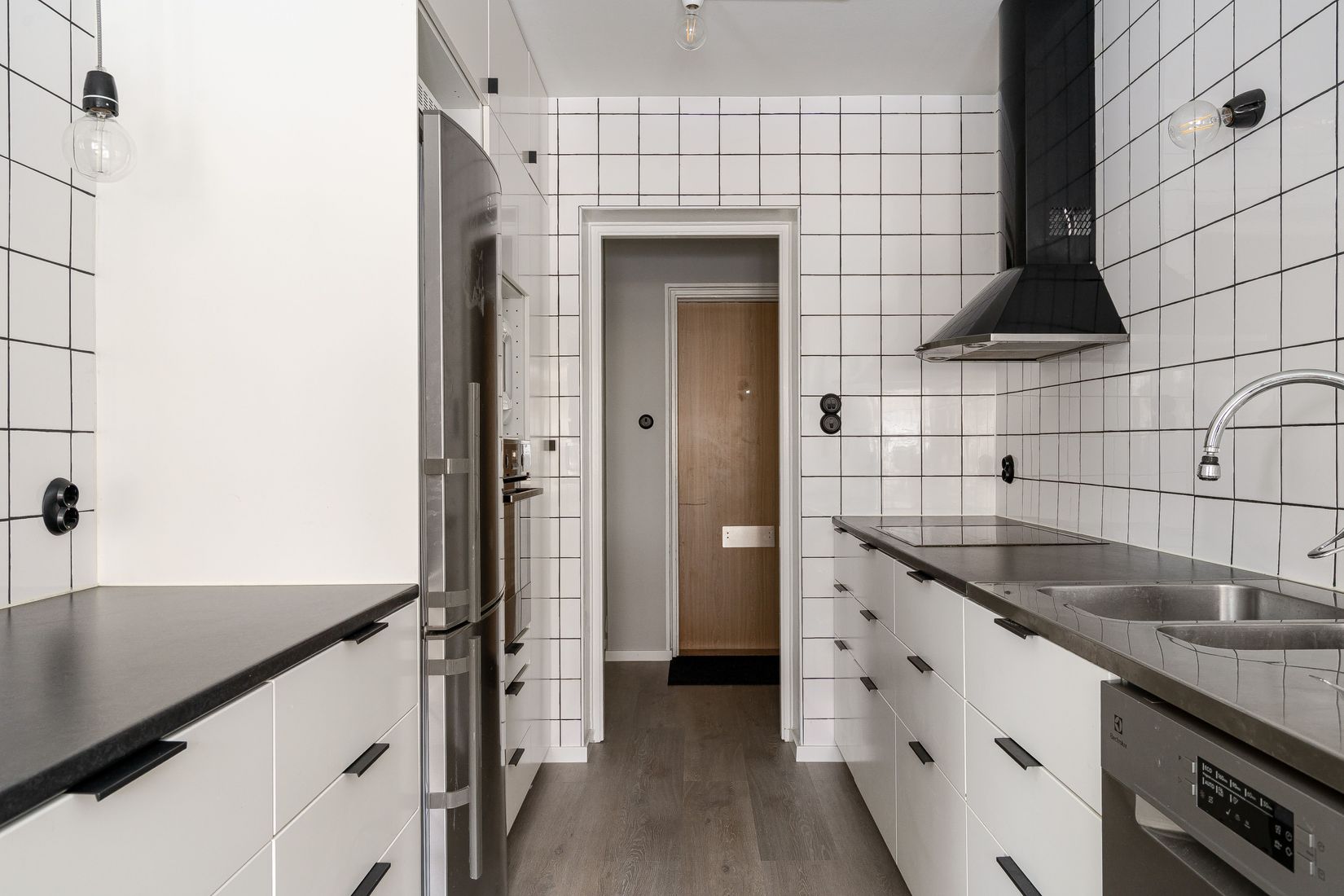 Köket är funktionellt och ljust med vitt kakel ovan arbetsbänk samt arbetsbänk i laminat. Den maskinella utrustningen består av induktionshäll, diskmaskin, inbyggd ugn och mikro samt kombinerad kyl och frys. Här finns gott om plats för en matgrupp för 4–6 personer.