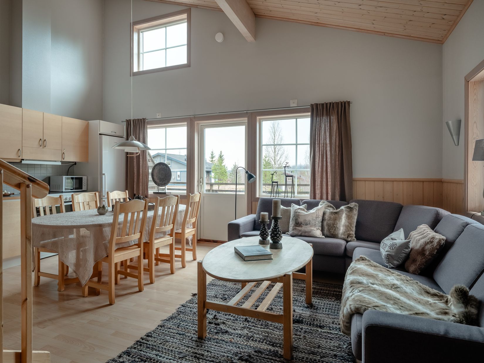 Bostaden är fördelad på ett plan med ovanvåning och erbjuder en genomtänkt planlösning som passar både familjen och sällskap som vill samlas. Storstugan är ljus och rymlig med ordentligt med plats för både soffgrupp och matbord. Kaminen bidrar med värme och trivsel efter aktiva dagar utomhus, och härifrån nås även altanen som bjuder på utsikt över fjällmiljön. Köket ligger i öppen anslutning och är praktiskt utformat.
