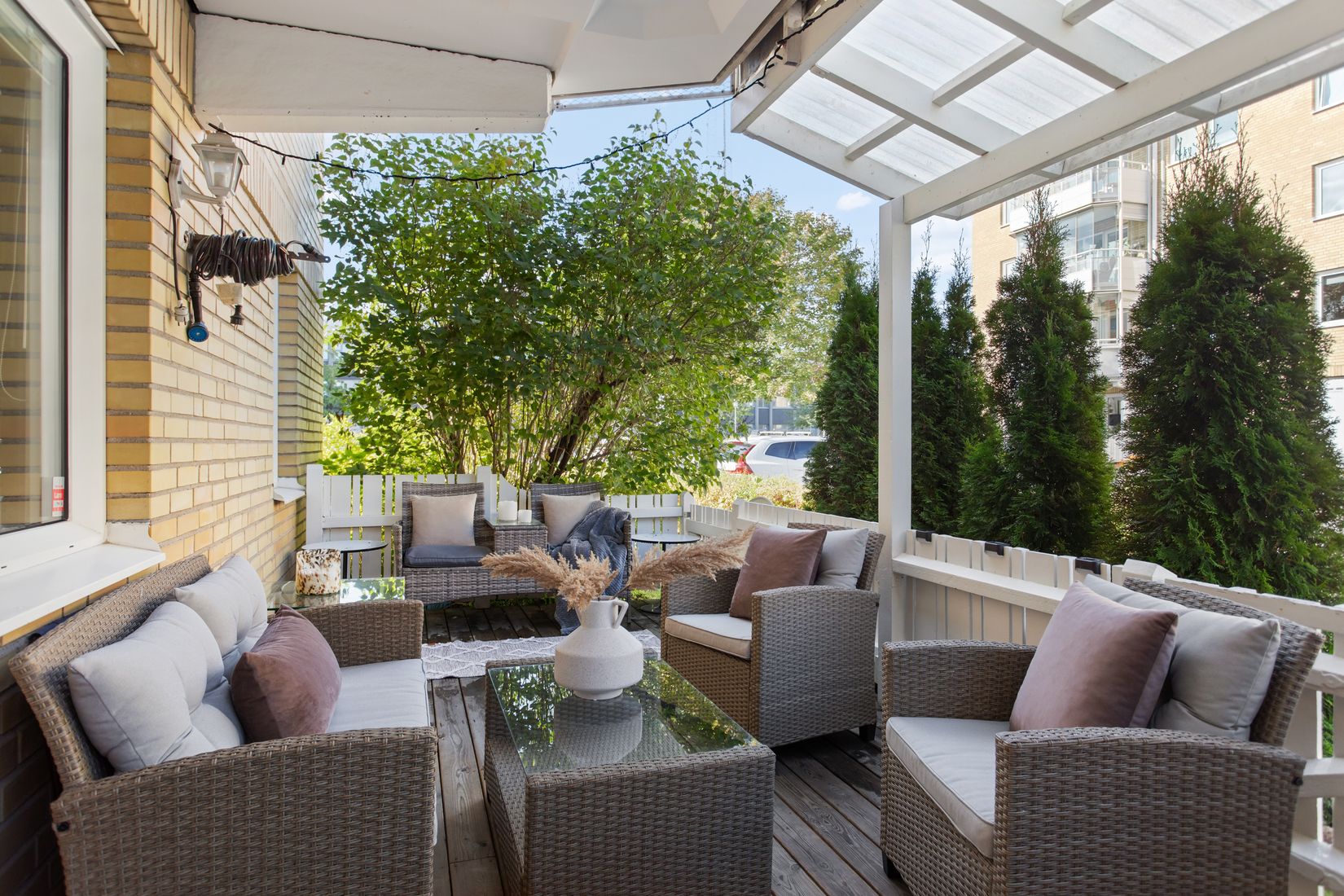 Välkommen till en välplanerad och ljus 3:a med stor tillhörande uteplats som ger en härlig radhuskänsla! Bostaden är i ett genomgående fint skick med nyrenoverat kök, helkaklat badrum och renoverade ytskikt. Lägenheten har stora sociala ytor med öppen planlösning mellan kök, matplats och vardagsrum, vilket skapar en extra luftighet i bostaden. Som en förlängning av de sociala ytorna finns en stor tilltagen uteplats med gott om plats för umgänge och lek utomhus. Här kan man njuta av både mysiga frukostar och härliga grillkvällar med plats för hela familjen och vänner. Utöver detta erbjuds två bra planerade sovrum, helkaklat badrum med tvättmaskin, klädkammare samt ett kontor/extra klädkammare beroende på behov. Det finns gott om olika sätt att möblera och man kan med enkelhet även bygga till ett tredje sovrum, om så önskas (se alternativ planritning). Bostaden får in rikligt med ljusinsläpp från två håll och lägenheten ligger med ett fritt och skyddat läge intill lugn återvändsgata. Här får du en perfekt kombination av mysig radhuskänsla och stadens puls bara en kort resa bort!